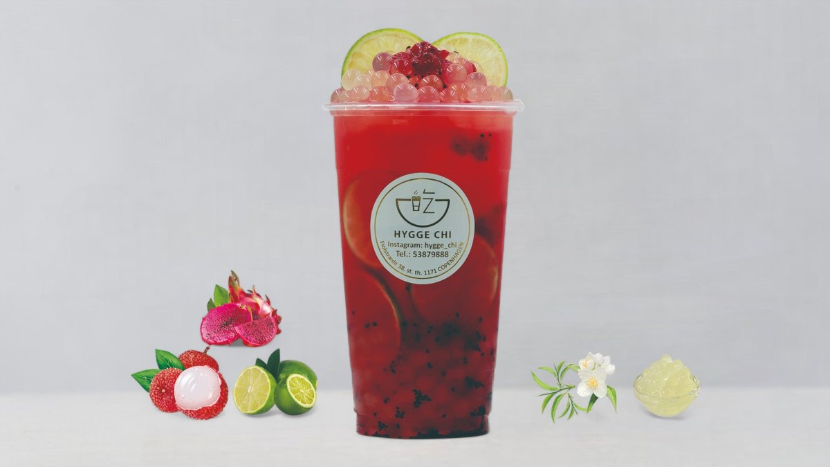 Kold drik lavet på frisk øko lime, litchi kompot, dragefrugt, grøn te og sukker. Serveres med litchi boba.