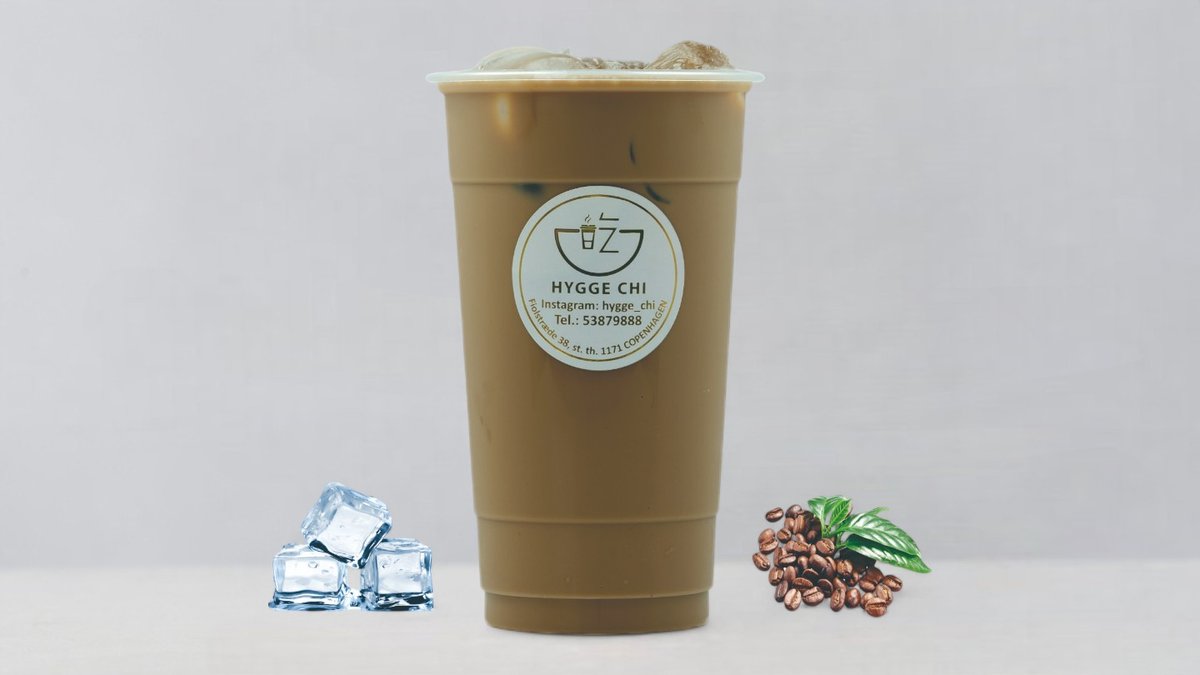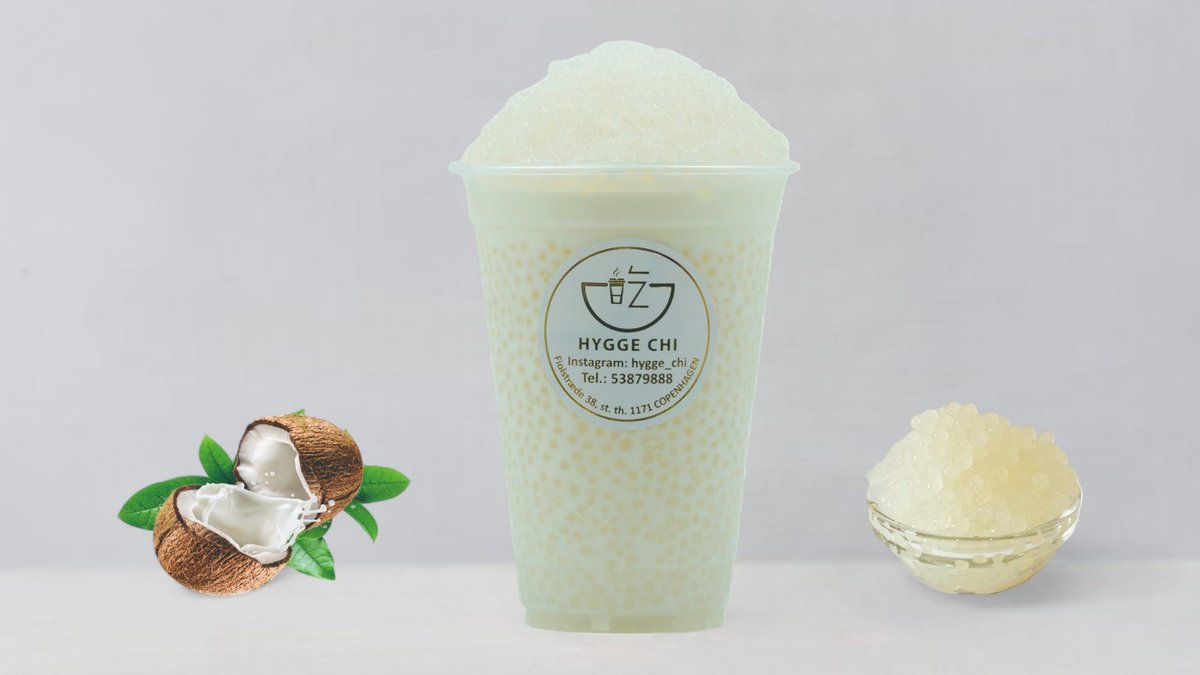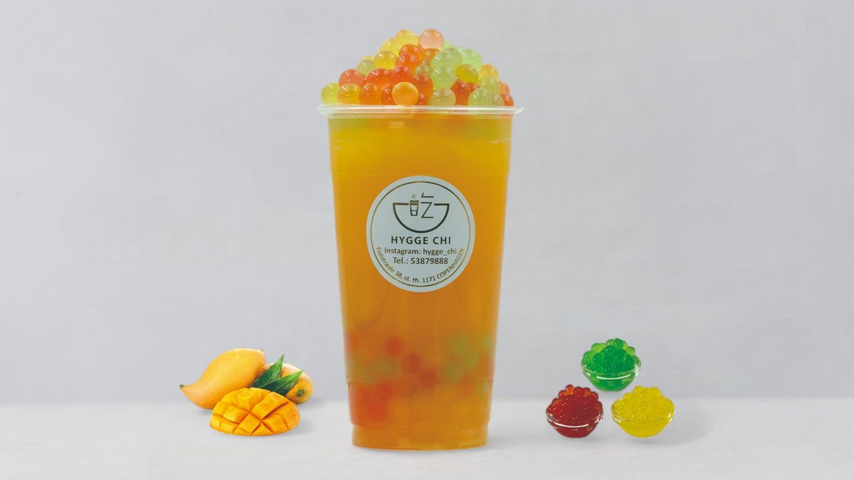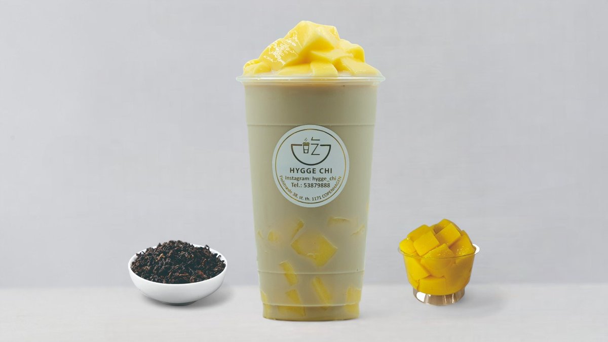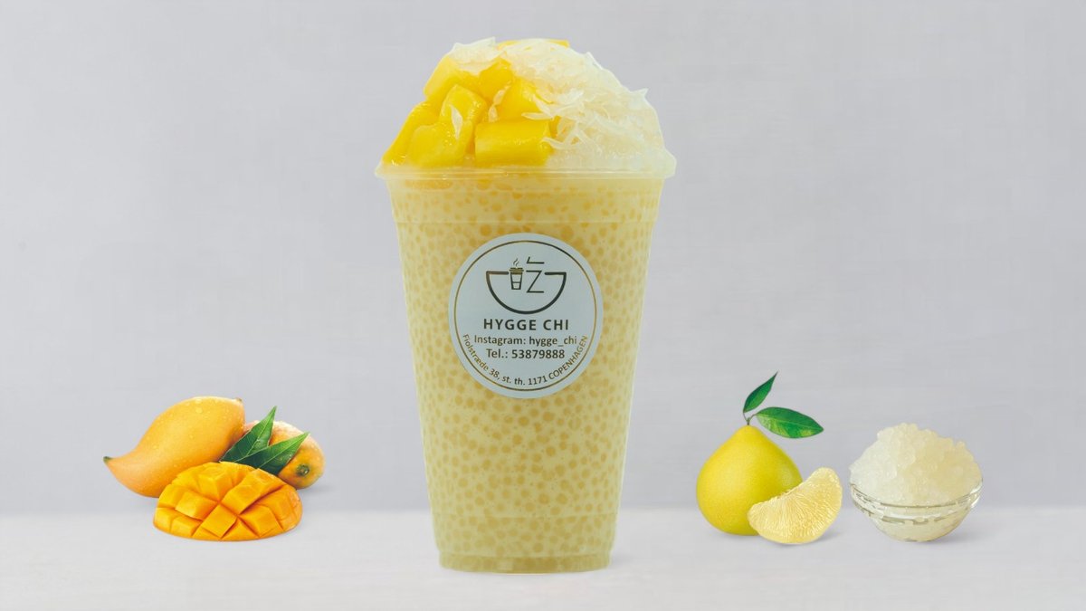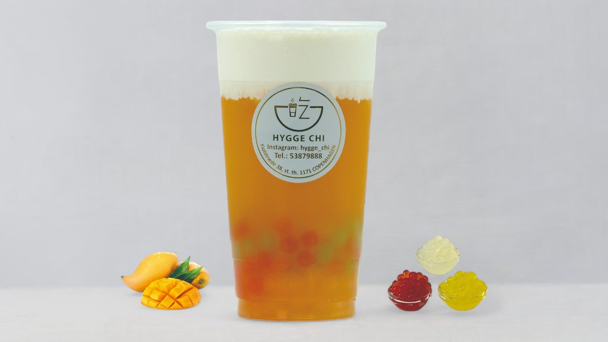 Mangokompot, mælkeskum, grøn te og sukker. Serveres med 3 valgfri boba.