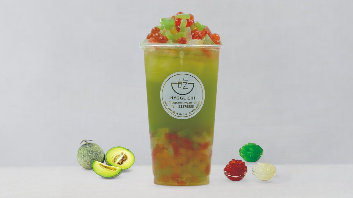 Honningmelonskompot, grøn te og sukker. Serveres med op til 3 valgfri boba.