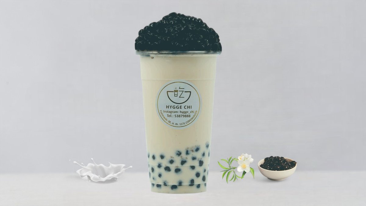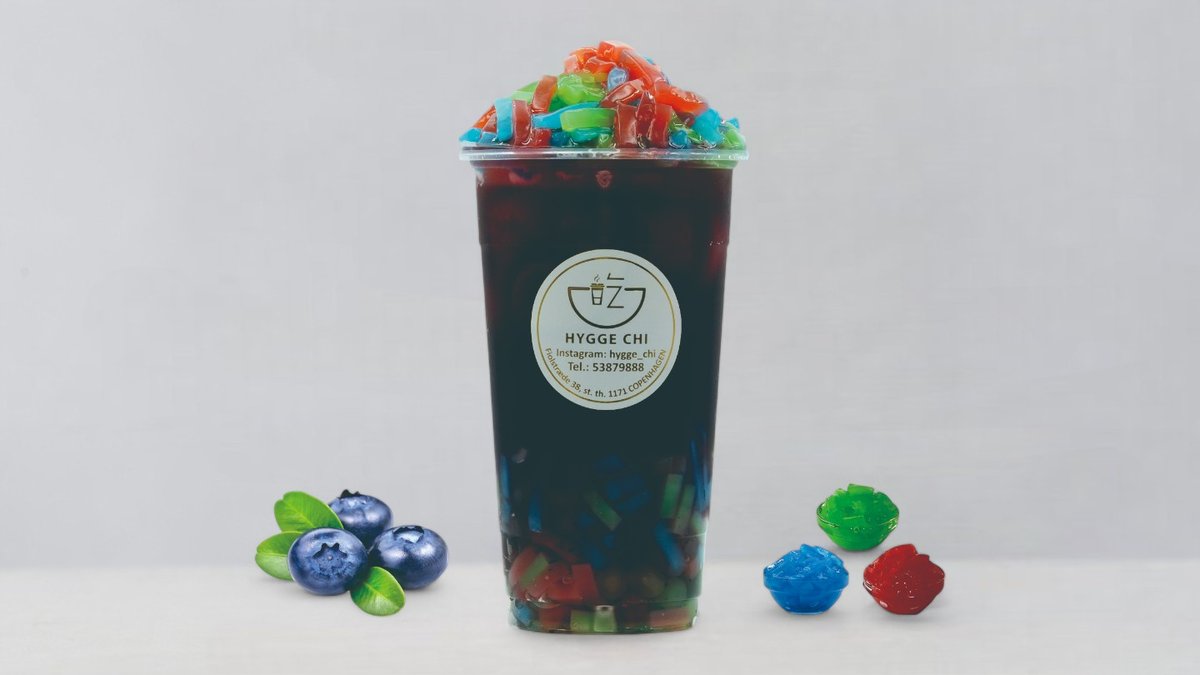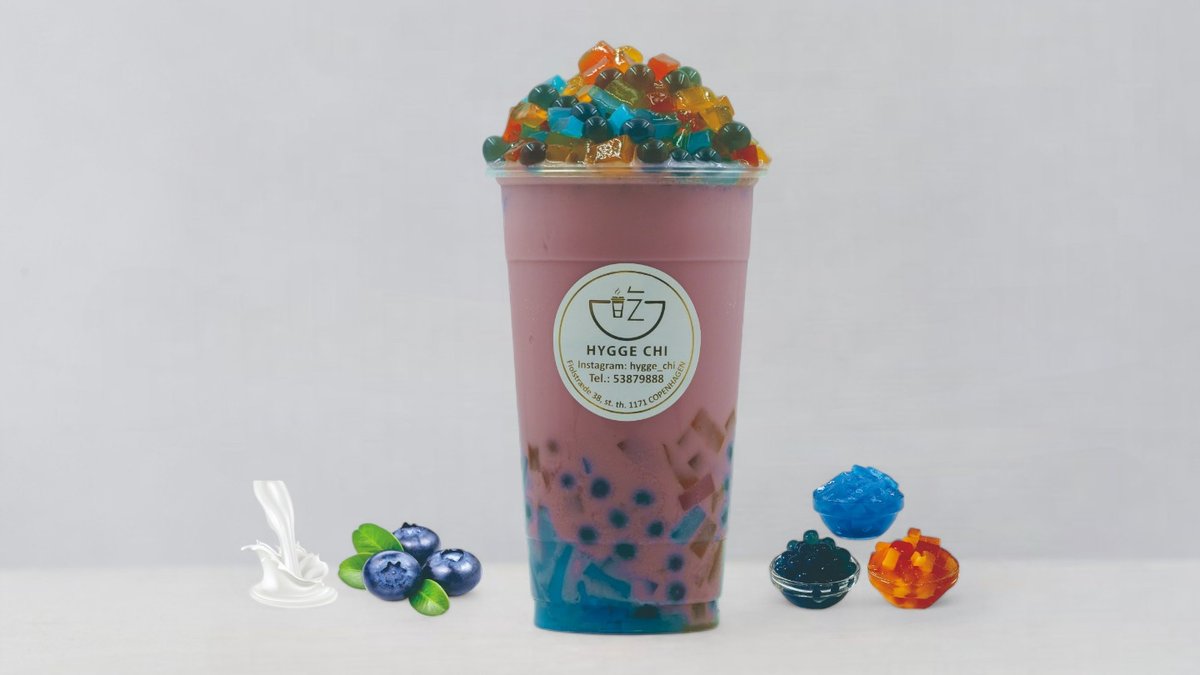Blåbærskompot, mælk, grøn te og sukker. Serveres med 3 valgfri boba.