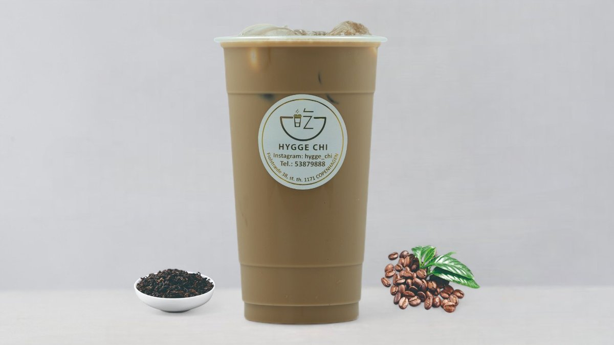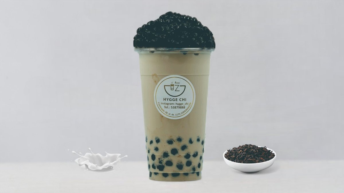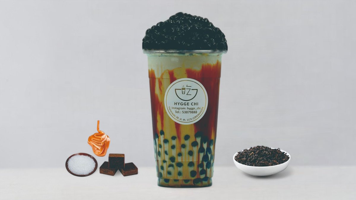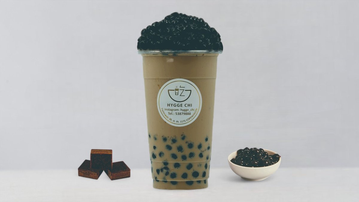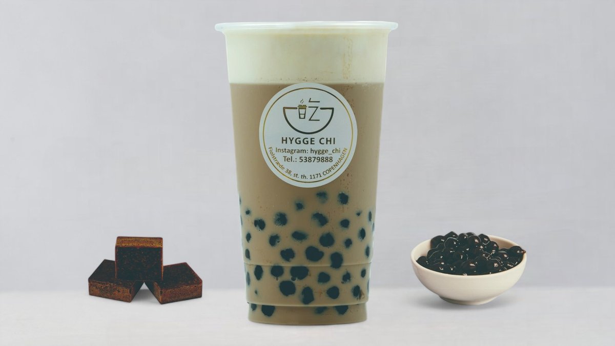 Sort te, chokolade, mælk, tapioca perler og brun farin.