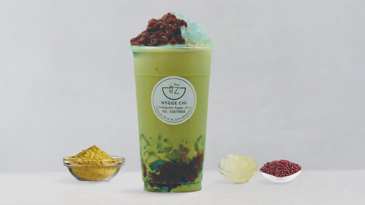 Jasmin grøn te, matcha, søde røde bøner, kokos, mælk og sukker.