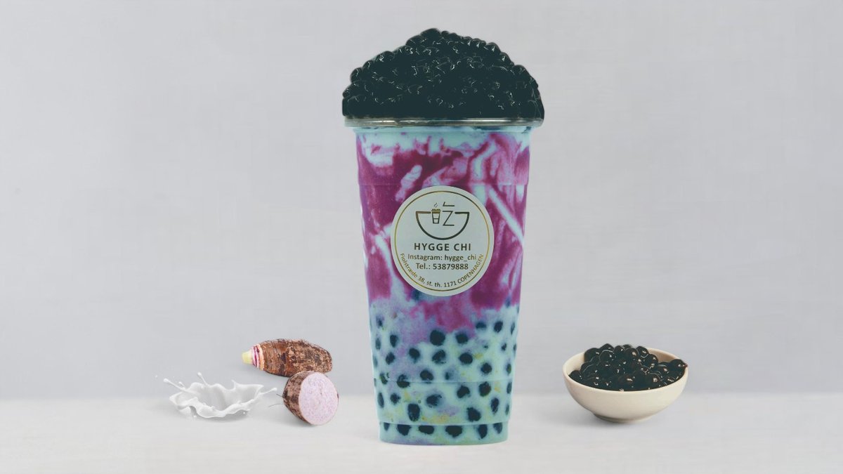 Taro, mælk og sukker. Serveres med tapioca pearls.