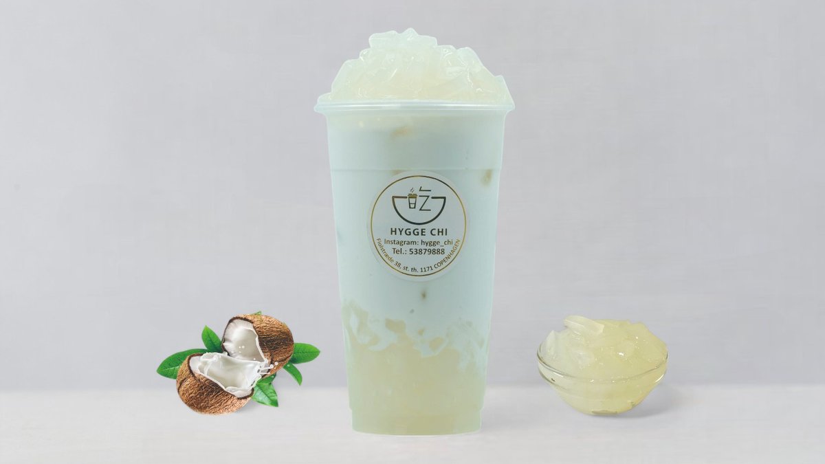 Frisk vandmelon, kokosmælk, jasmin grøn te og sukker. Serveres med vandmelon boba.