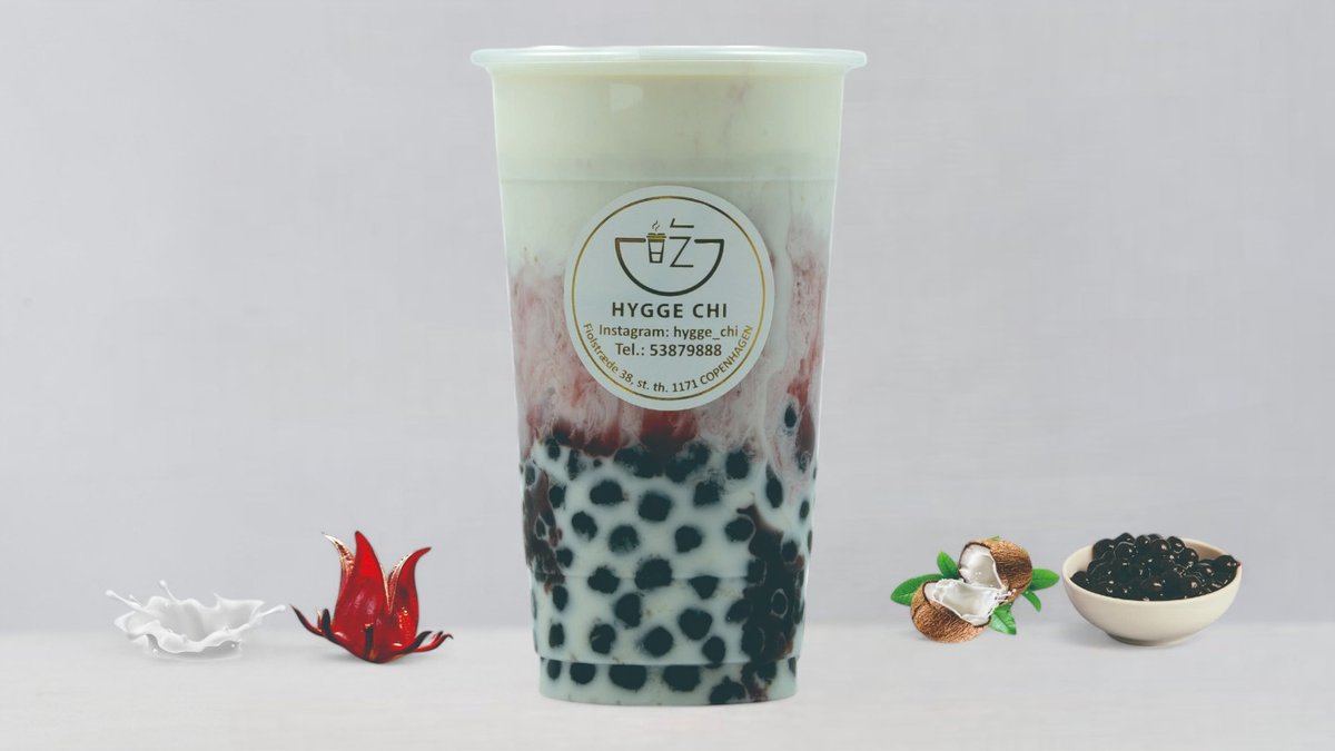 Hibiscus, mælk, kokosmælk, mælk og tapicoa perler. Ps kan laves mindst 50% sukker
