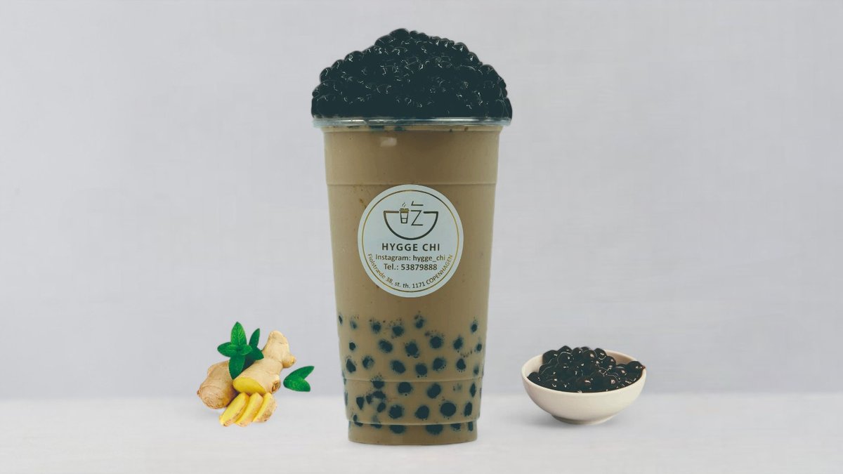Sort te, ingefær, mælk, tapioca perler og brun sukker.