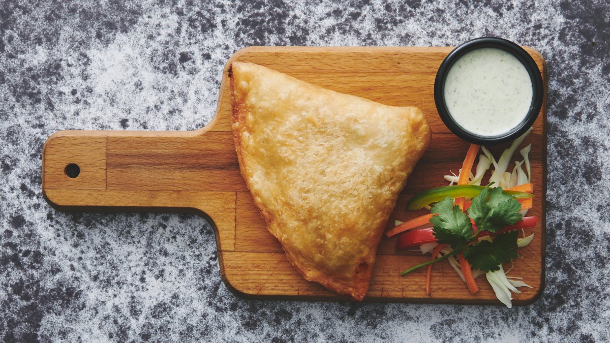 Samosa med grøn ærte karry, yoghurt, chili og chaat masala.