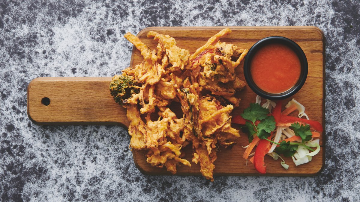 Tynde løg skiver i kikærtedej og friteret i olie.
