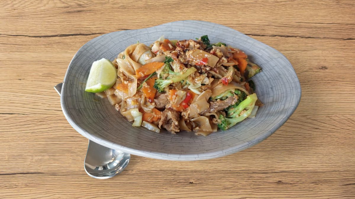 Brede ris nudler med chili, hvidløg, løg, gulerødder, spidskål, javaingefær og thai basilikum.