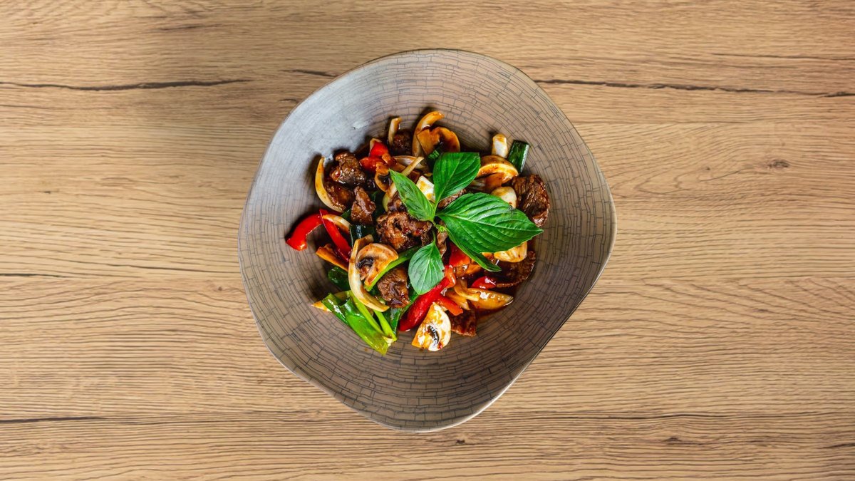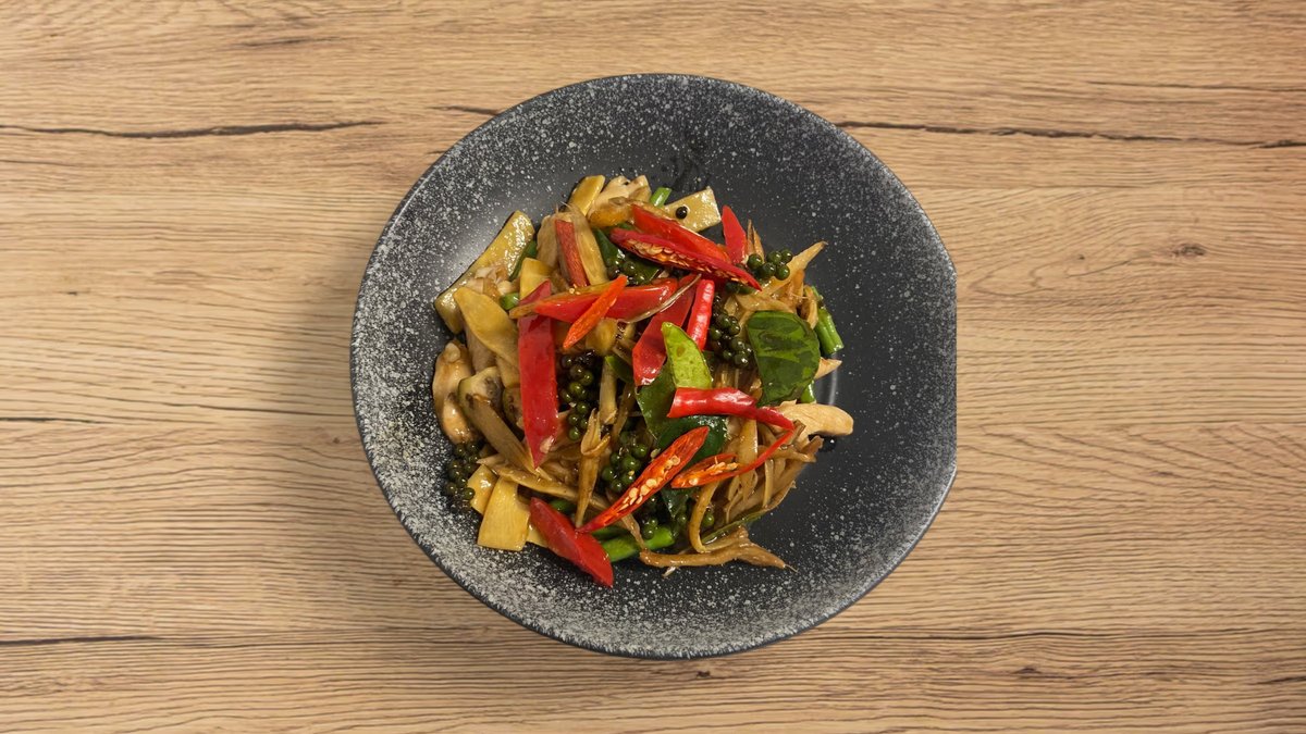 Krydret wok med løg, chili, hvidløg, lange bønner, bambus, limeblade, Javaingefær og thai basilikum.