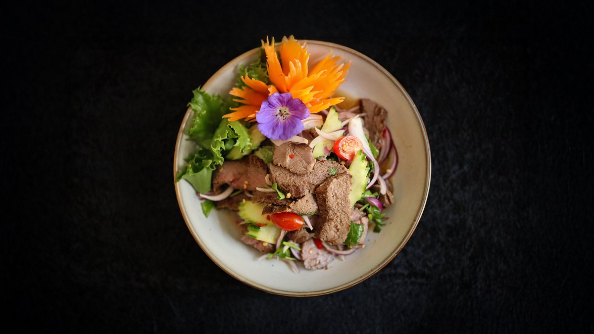 Thai salat med cherrytomat, agurk, forårsløg, rødløg, korainder i stærk chilimariande