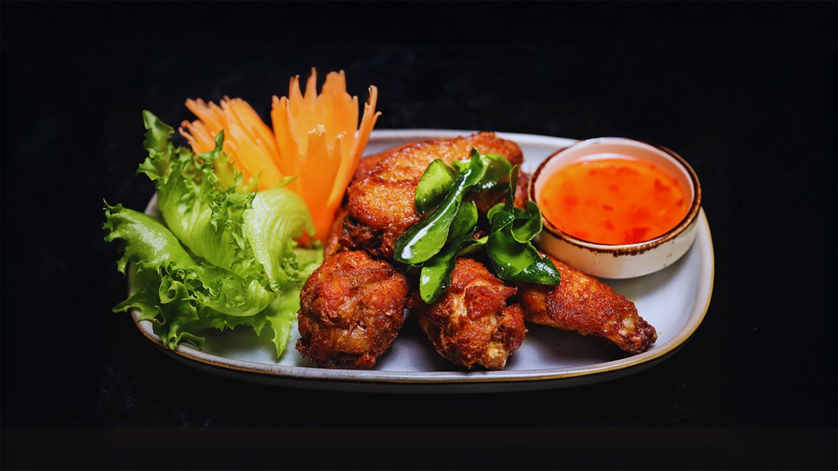 5 stk. sprøde kyllingevinge med smag af citrongræs. Serveres med sød chilisauce og spidskål