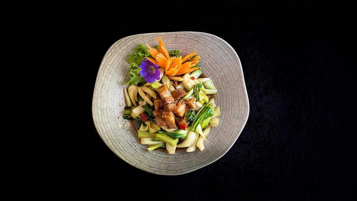 Sprødt flæsk i østersauce med asiatisk kål, hvidløg og chili. Ris medfølger.