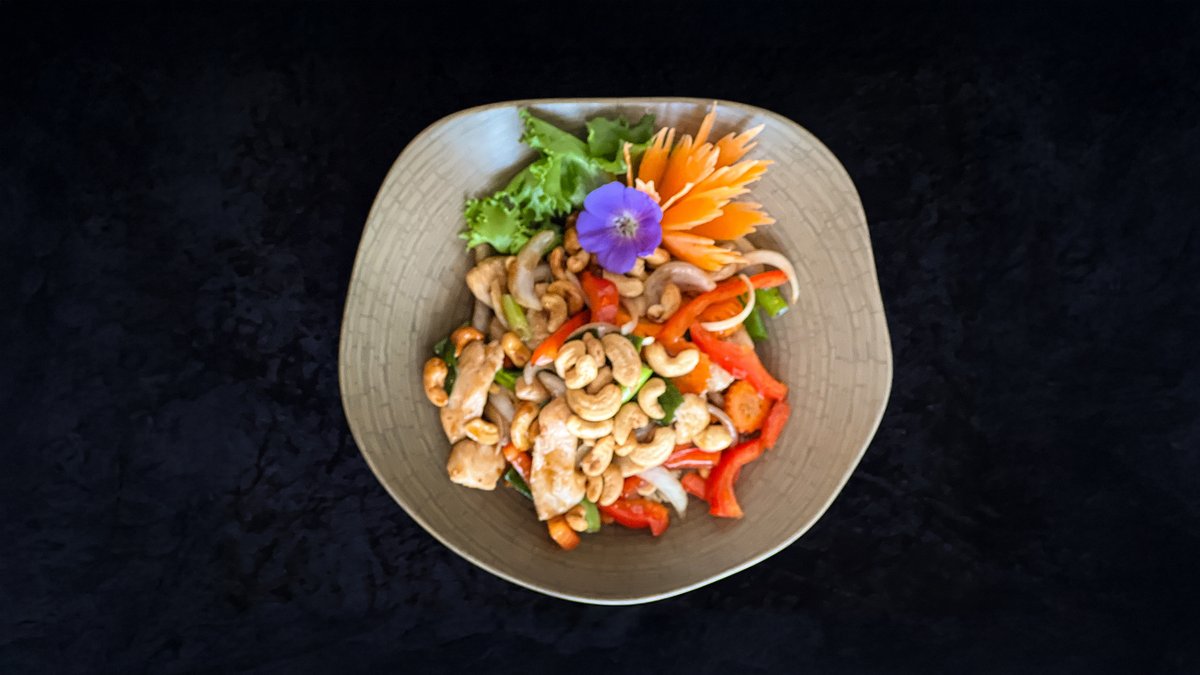 Cashewnødder med gulerødder, løg, peberfrugt, forårsløg.