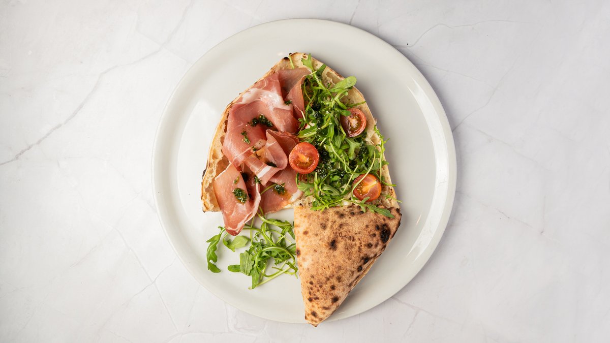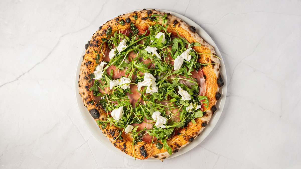 Tomatsauce, mozzarella, lufttørret skinke, rucola, bøffelmozzarella og basilikumcreme.