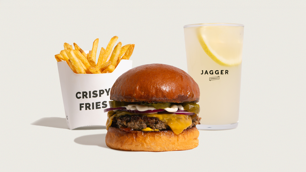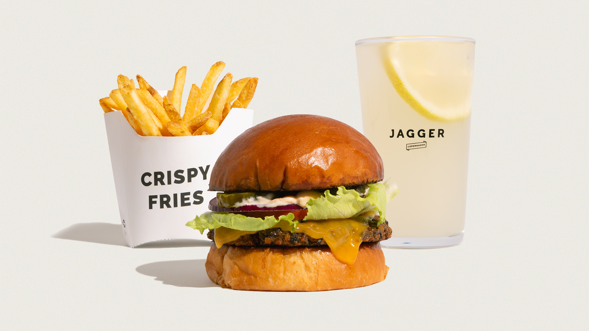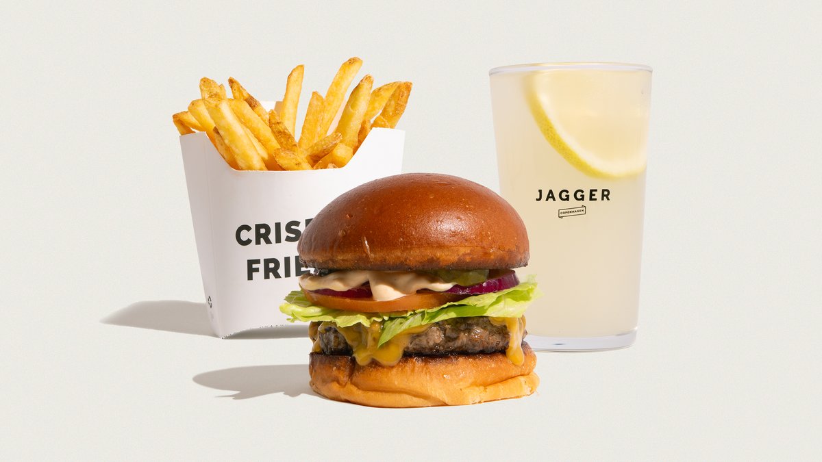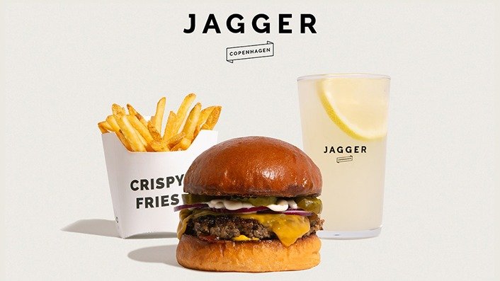 Økologisk burgerbolle, økologisk friskhakket dansk oksekød, tomat, salat og løg. Jagger dip, pickles og cheddar. Serveres med pommes frites, og en valgfri sodavand, vand eller dåseøl. Mulighed for at tilføje en valgfri dip.