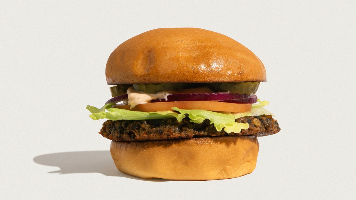 Økologisk veggiebøf*, mushroom garum, tomat, salat, rødløg, pickles & vegansk Jagger sauce i en glutenfri bolle.