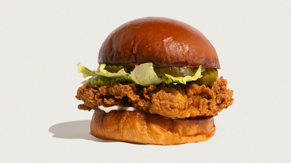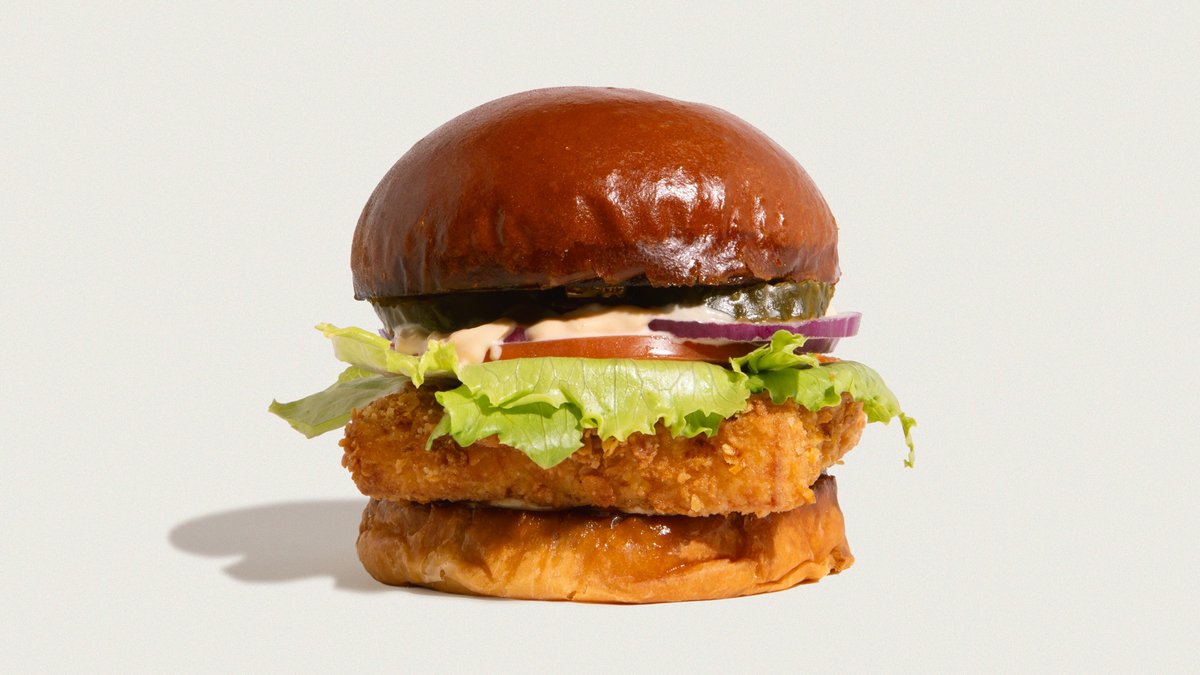 Økologisk burgerbolle, friskpaneret kyllingeoverlår, salat, pickles, mayo & chipotle mayo.