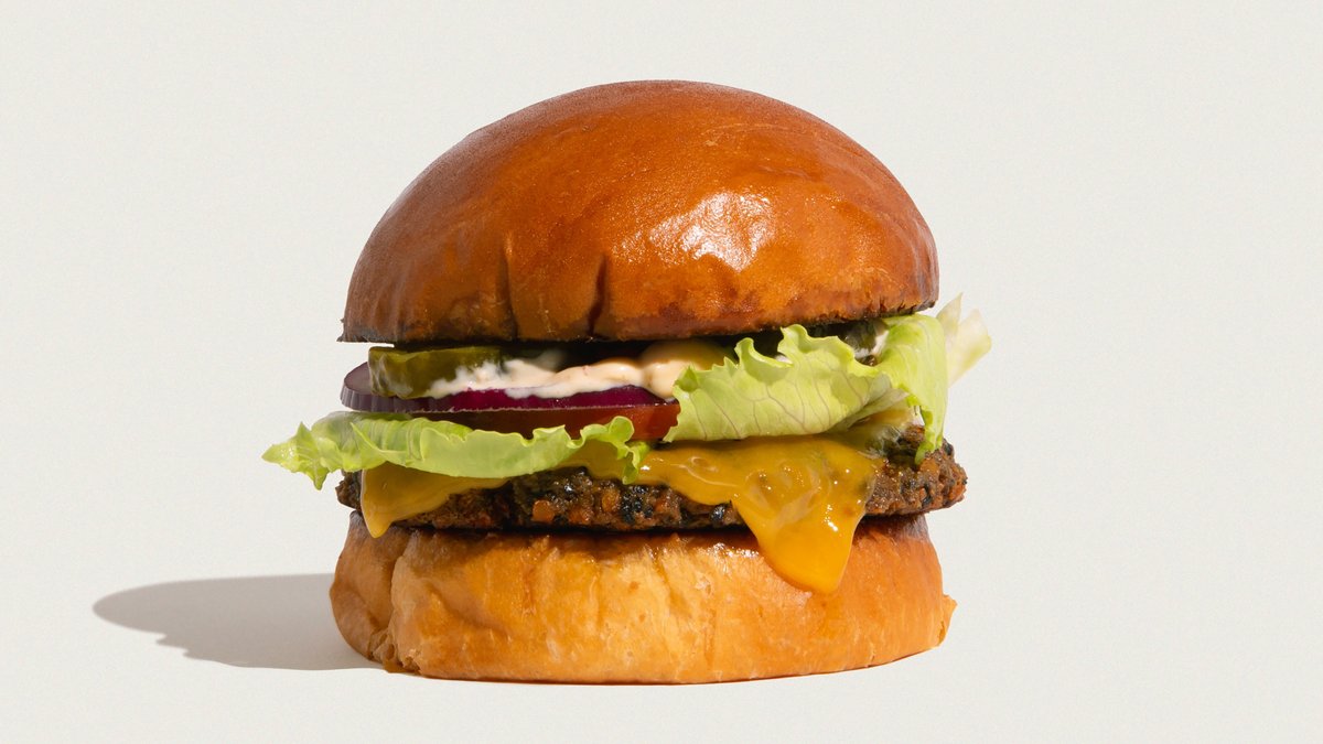 Økologisk burgerbolle, økologisk veggiebøf*, mushroom garum, cheddar, tomat, salat, rødløg, pickles & Jagger sauce. *Indeholder gluten