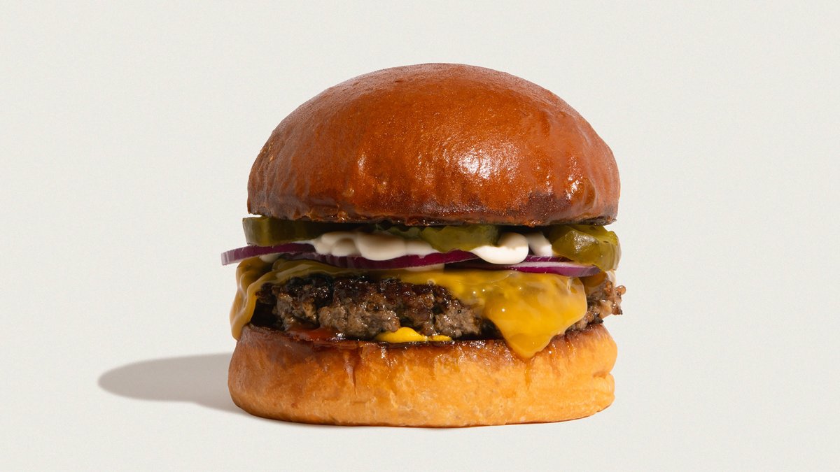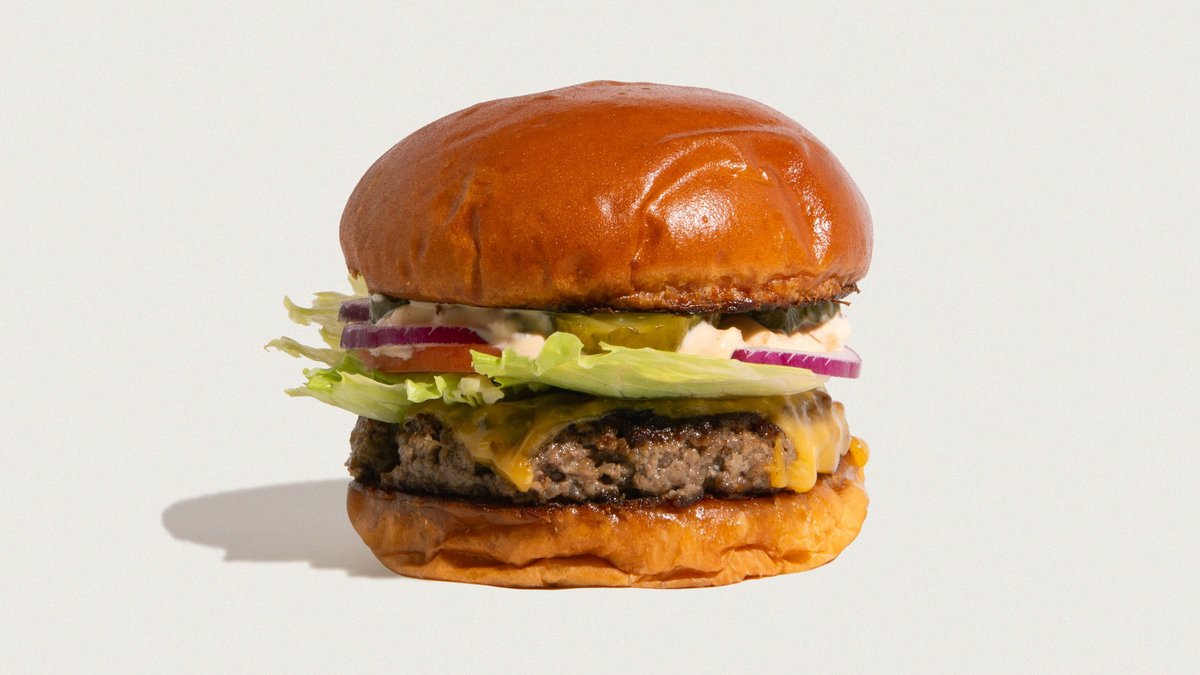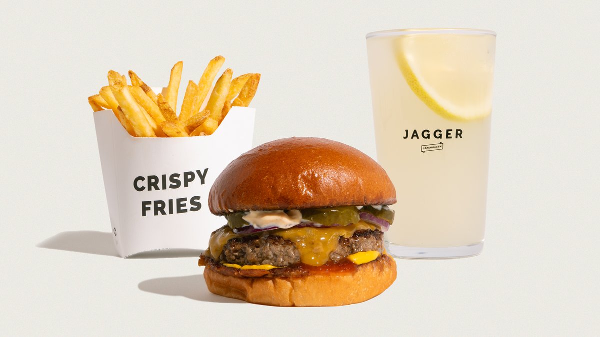 Økologisk burgerbolle, økologisk friskhakket dansk oksekød, ketchup, sennep, løg, pickles, jagger sauce og cheddar. Serveres med pommes frites, inklusiv en valgfri sodavand, vand eller dåseøl.