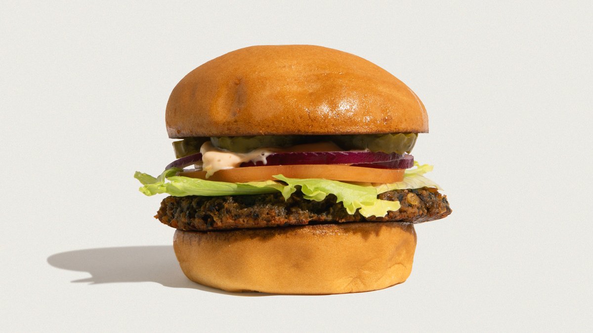 Økologisk burgerbolle, økologisk veggiebøf*, mushroom garum, tomat, salat, rødløg, pickles & vegansk Jagger sauce. *Indeholder gluten
