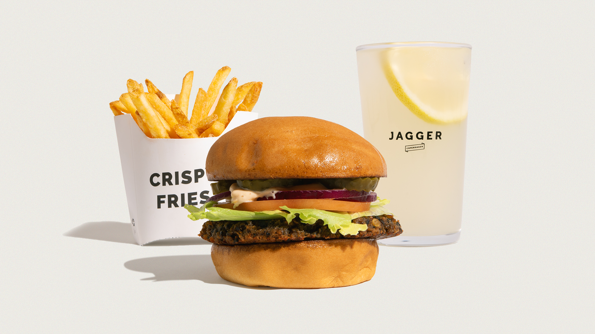 Økologisk mini burgerbolle, økologisk friskhakket dansk oksekød, tomat, salat og løg, Jagger dip, pickles og cheddar. Serveres med pommes frites, og en valgfri sodavand, vand eller dåseøl. Mulighed for at tilføje en valgfri dip.