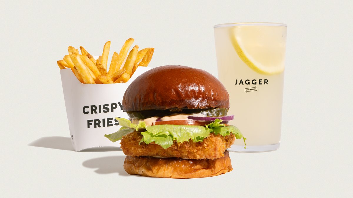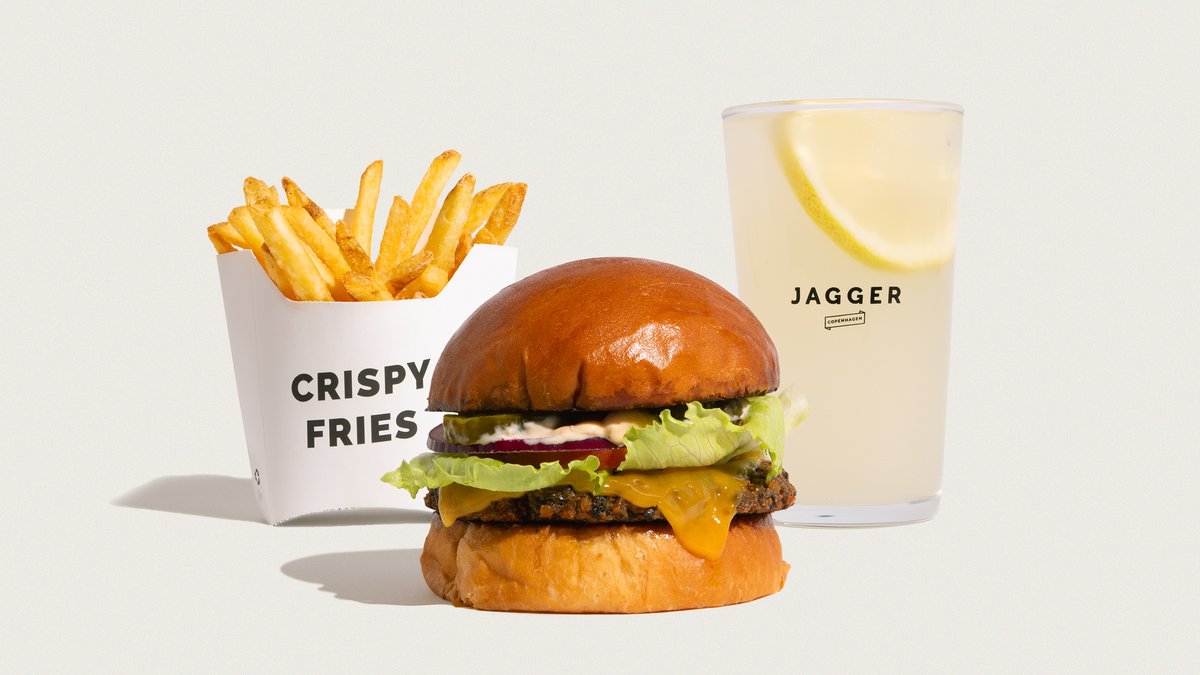 Økologisk burgerbolle, økologisk friskhakket dansk oksekød, tomat, salat og løg. Jagger dip, pickles og cheddar. Serveres med pommes frites, og en valgfri sodavand, vand eller dåseøl. Mulighed for at tilføje en valgfri dip.