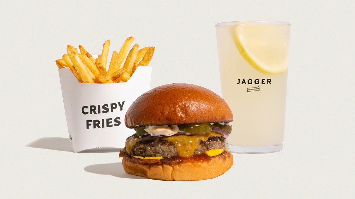 Økologisk burgerbolle,økologisk friskhakket dansk oksekød, tomat, salat og løg. Jagger dip, pickles og cheddar. Serveres med pommes frites, og en valgfri sodavand, vand eller dåseøl.