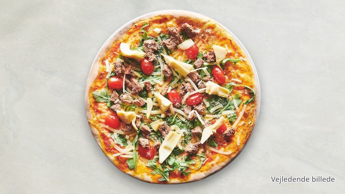 Tomatsauce, aubergine, grillet artiskok, squash, marinerede oksekødsstrimler, cherrytomater, pesto, parmesan og mozzarella.
