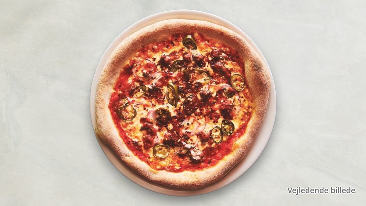 Tomatsauce, marineret lammekød, løg, jalapeños, hvidløg og mozzarella.