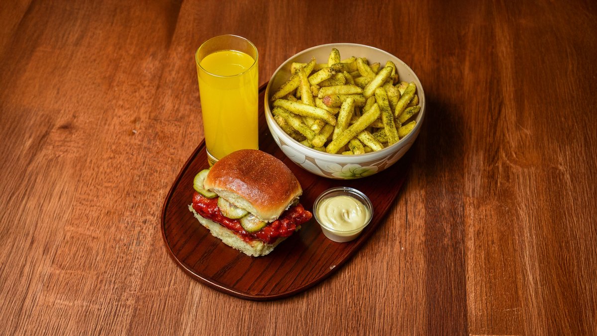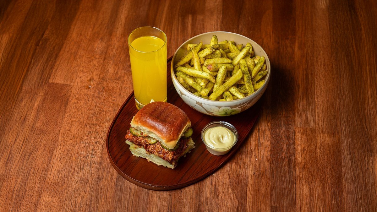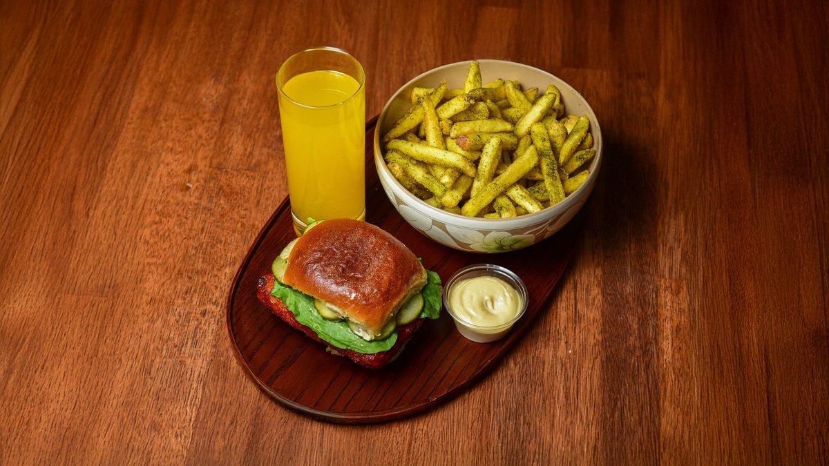 Korean Fried Chicken Sandwich serveret med pommes frites og valgfri drikkelse og dyppelse.
