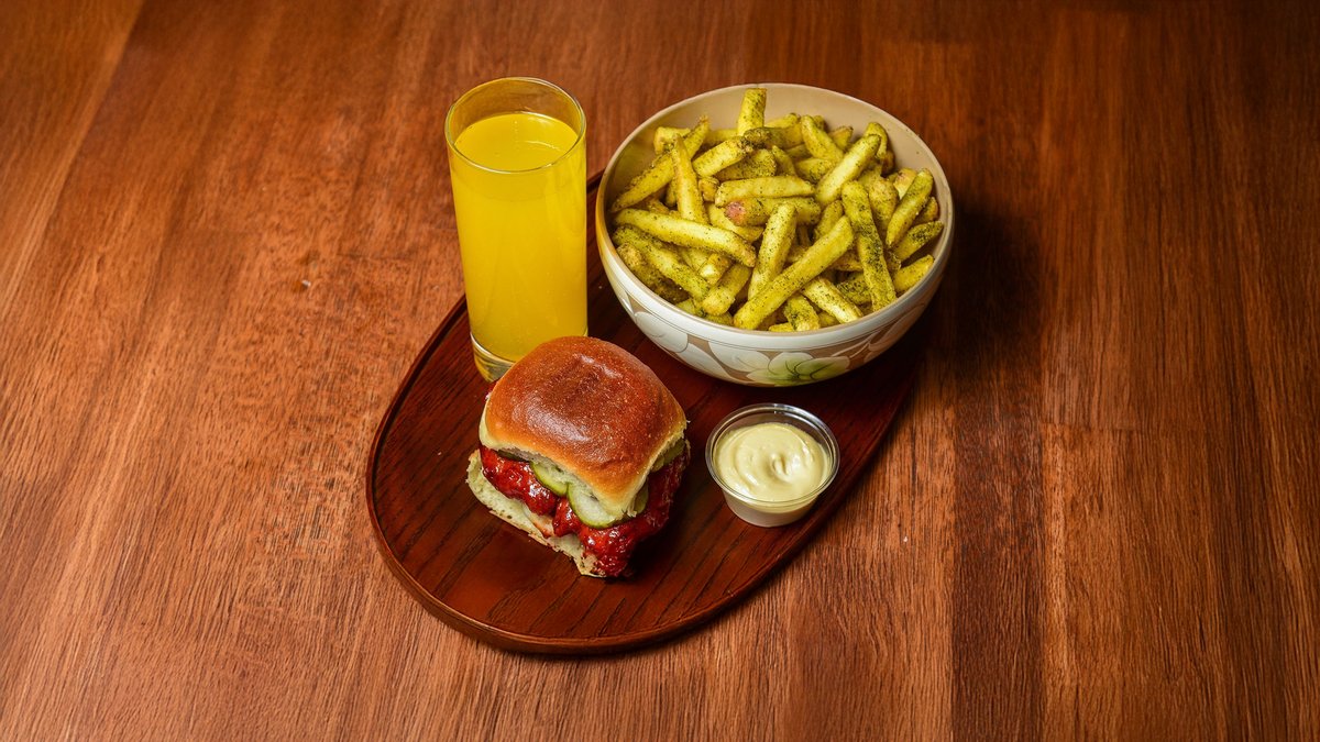 Korean Fried Chicken Sandwich serveret med pommes frites og valgfri drikkelse og dyppelse
