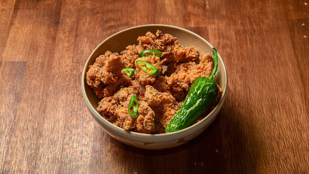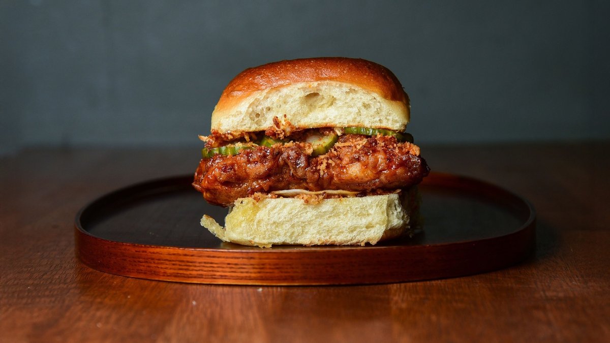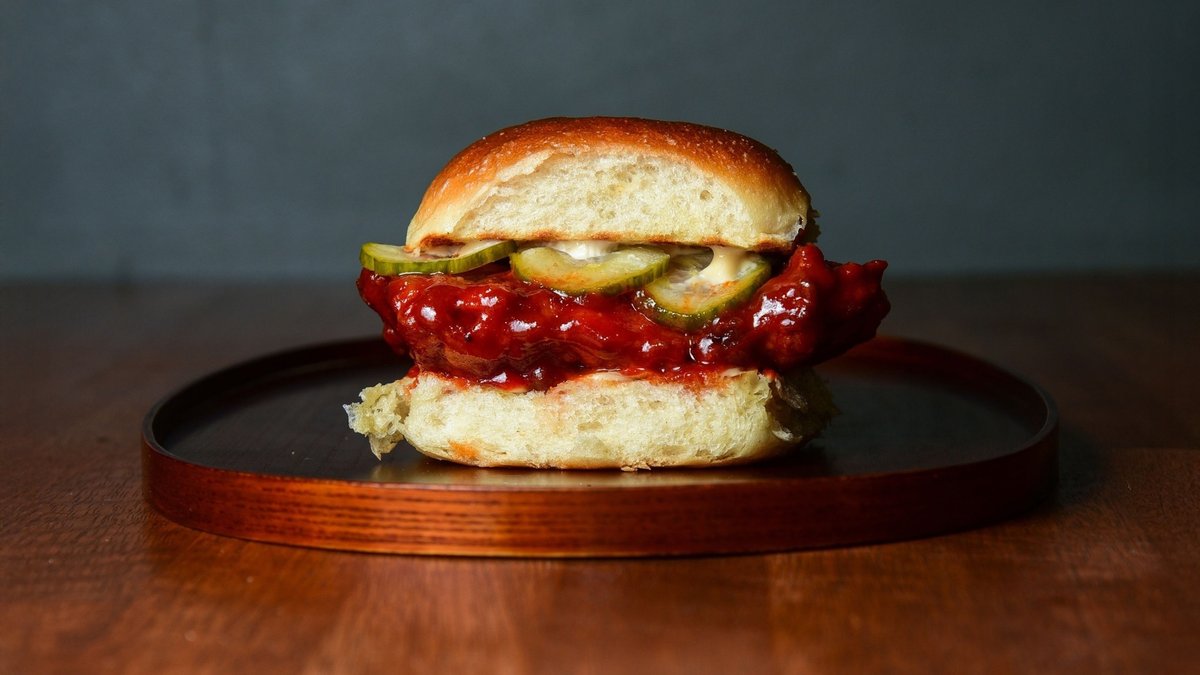 Med fyld af crispy kylling, gochujang, pickles og røget mayo.