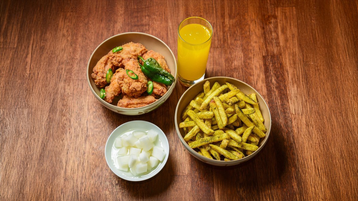 10 stk. Korean Fried Chicken Wings med valgfri sauce serveret med syltet daikon, pommes frites og valgfri drikkelse og dyppelse