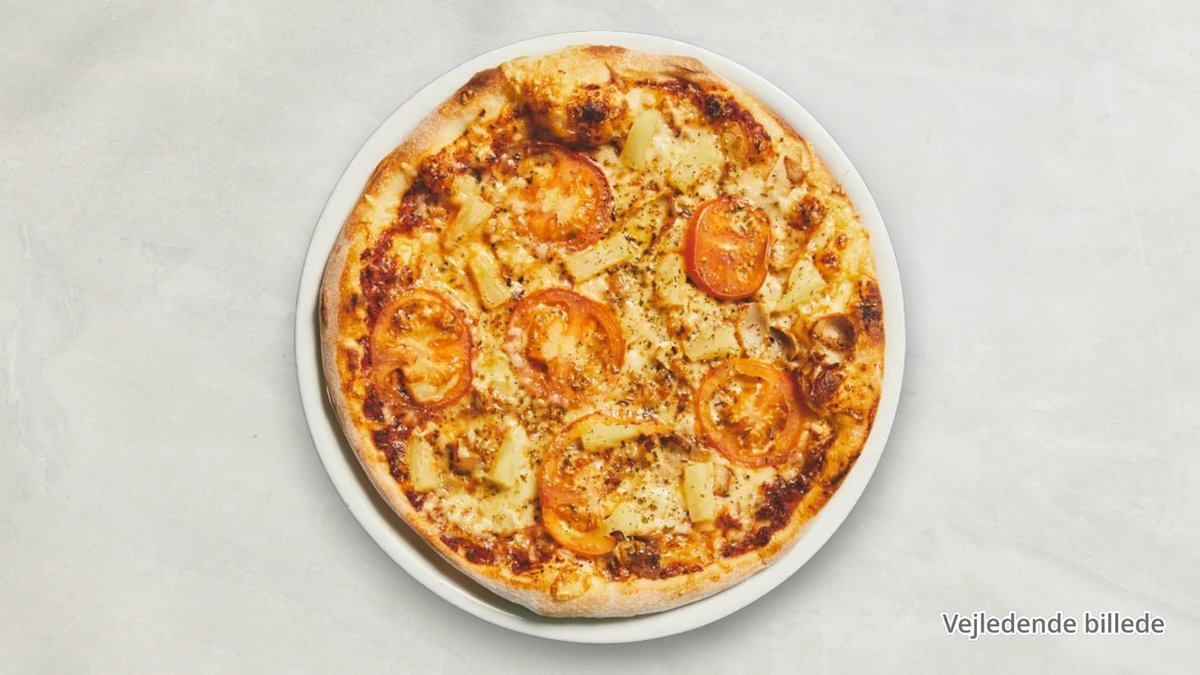 Tomat, ost, pepperoni, løg, paprika og ananas.