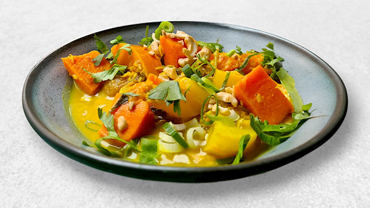 Mild karry med spinat og cashewnødder.
