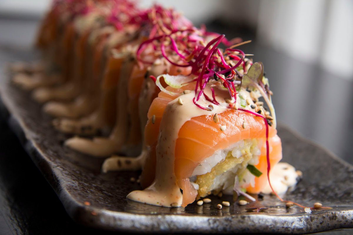 Crispy ebi, avocado og agurk, toppet med laks, chilimayo og forårsløg.