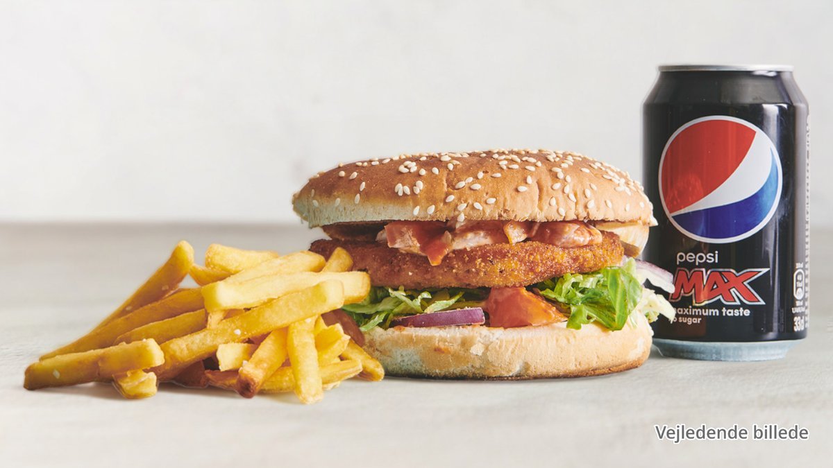 Med pommes frites, en dåsesodavand og valgfri dip.