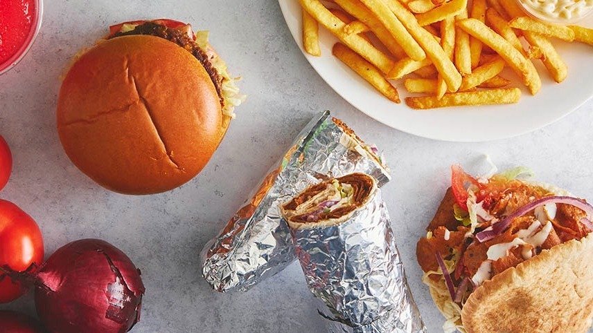 Valgfri protein serveret med pommes frites, salat, rødkål, tomat, agurk, løg,1 Stk Pitabrød og valgfri dyppelse.