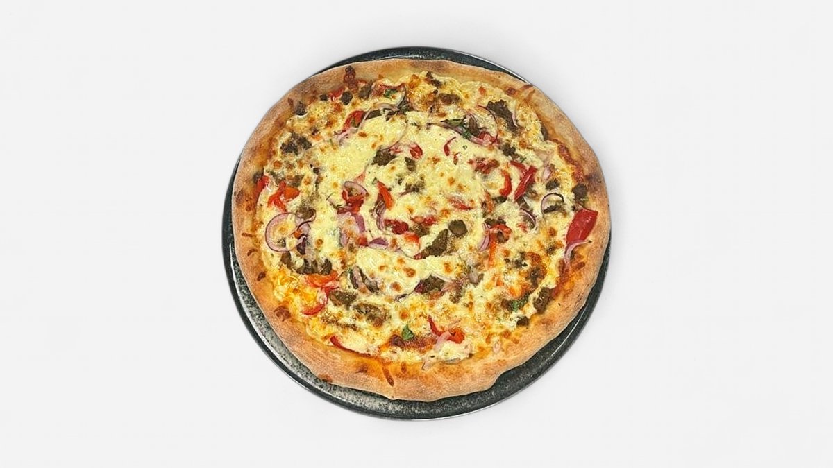 Tomatsauce, Mozzarella ost, Kødstrimler, Paprika, Løg og Bernaise-sauce