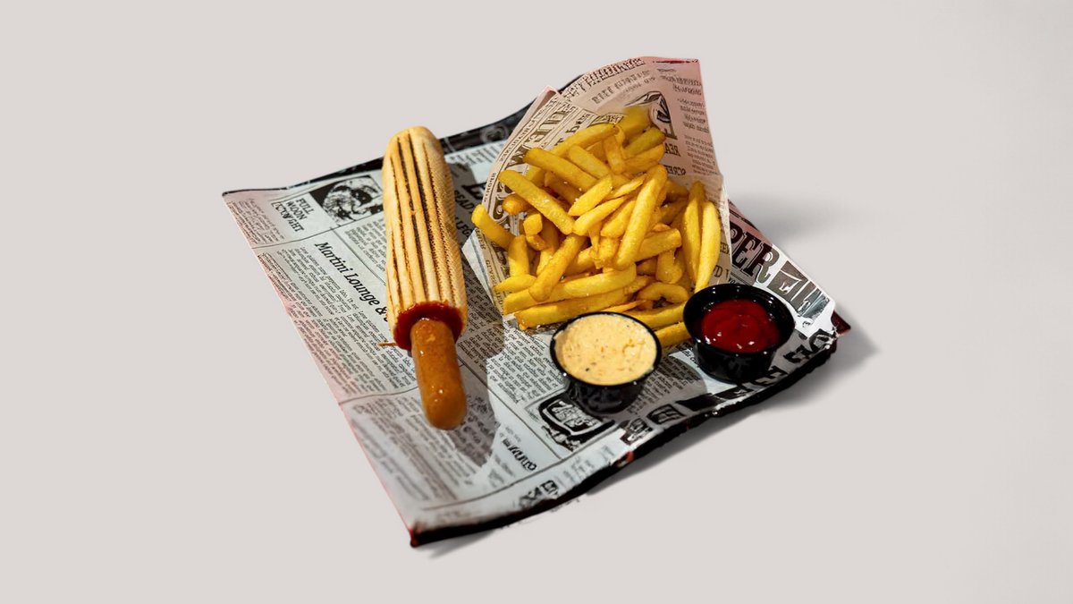 Serveret med pommes frites, valgfri dyppelse og 0,33 l sodavand.