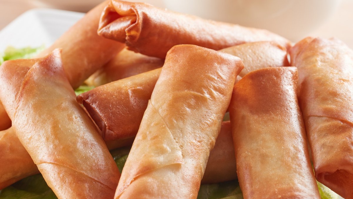 Hjemmelavede forsårsruller med kylling. Serveres med sursød sauce.