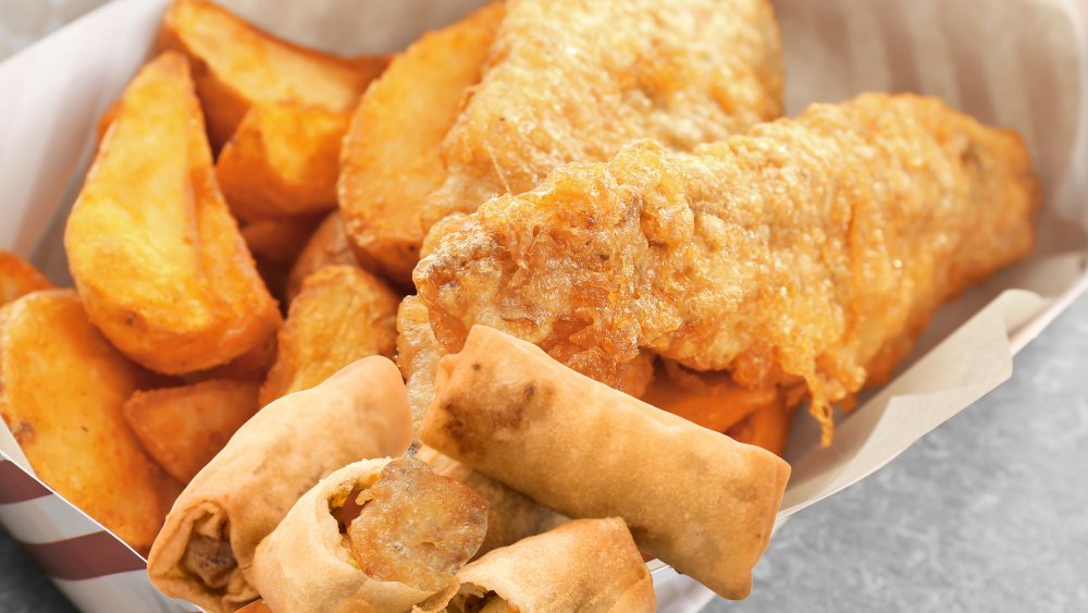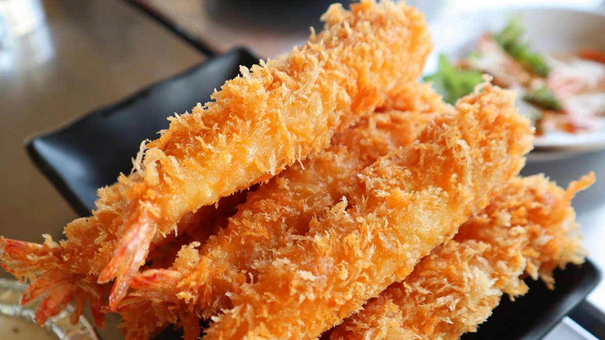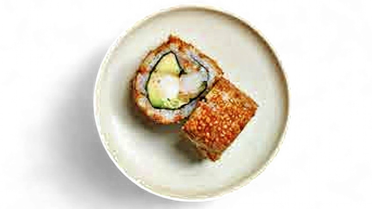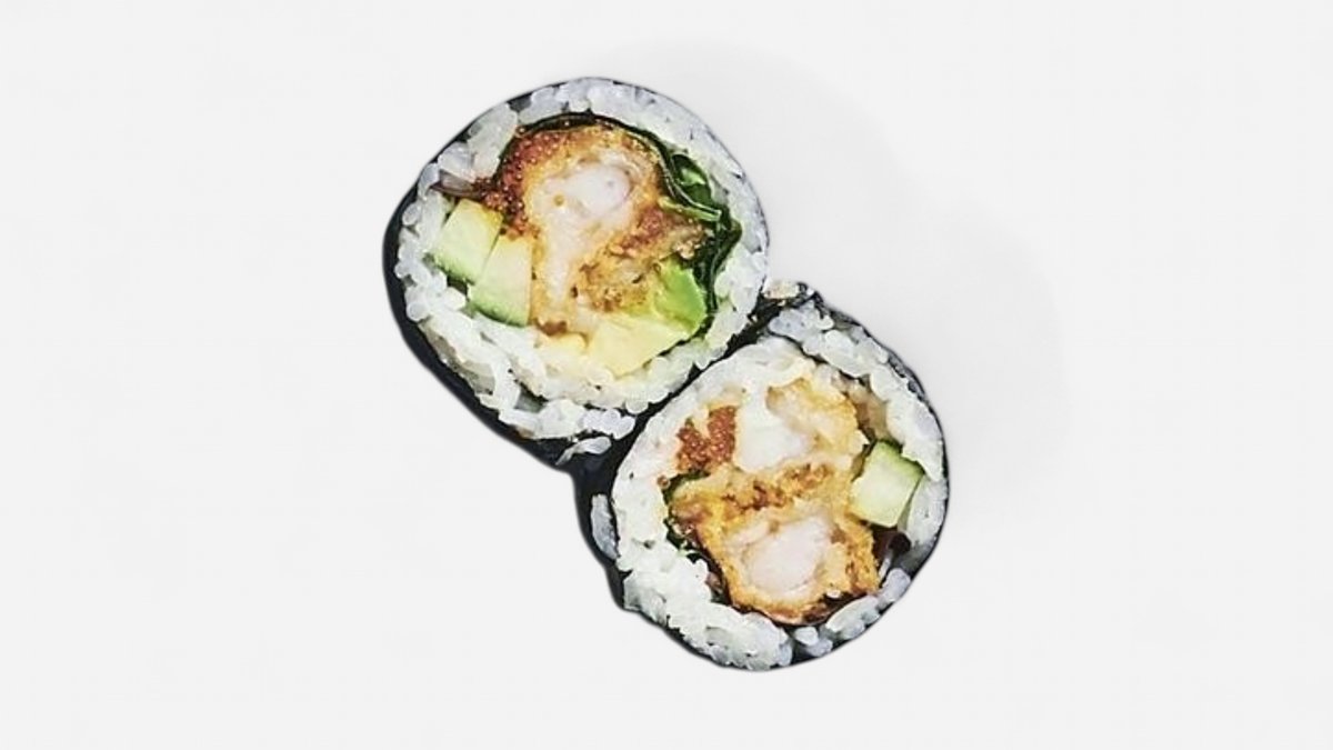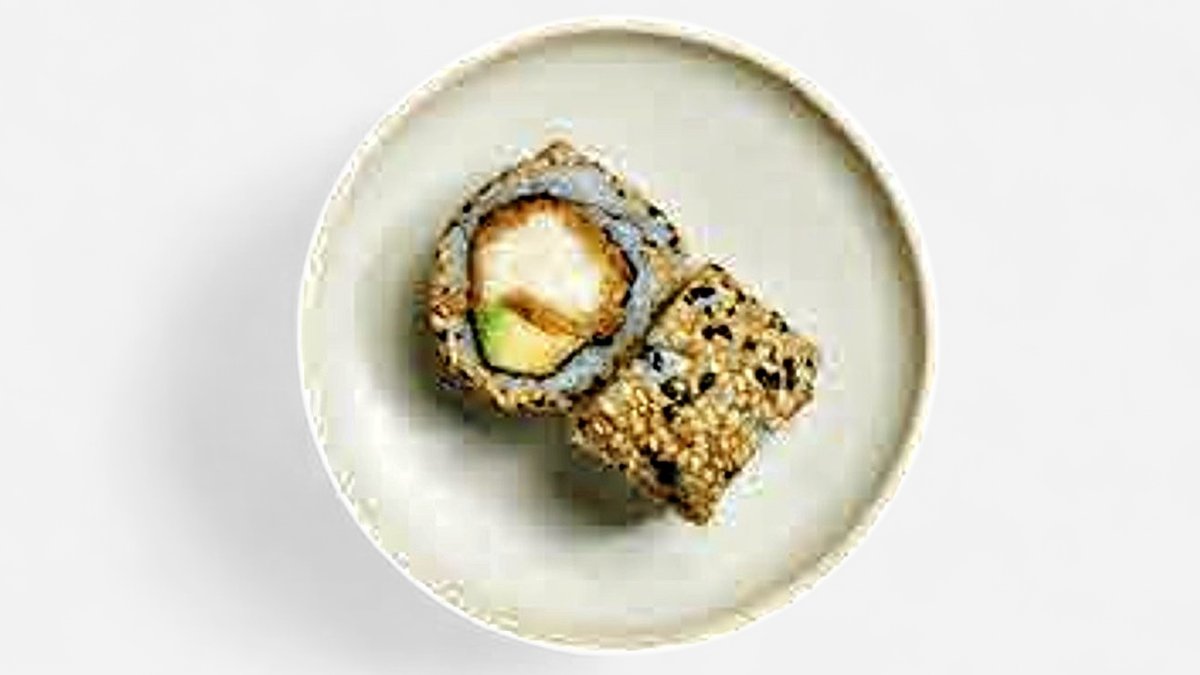 Tempura rejer, avocado, agurk rullet i tang og stegt m paneret brød