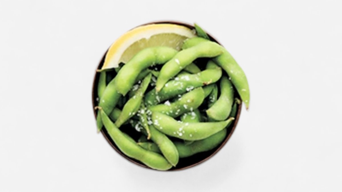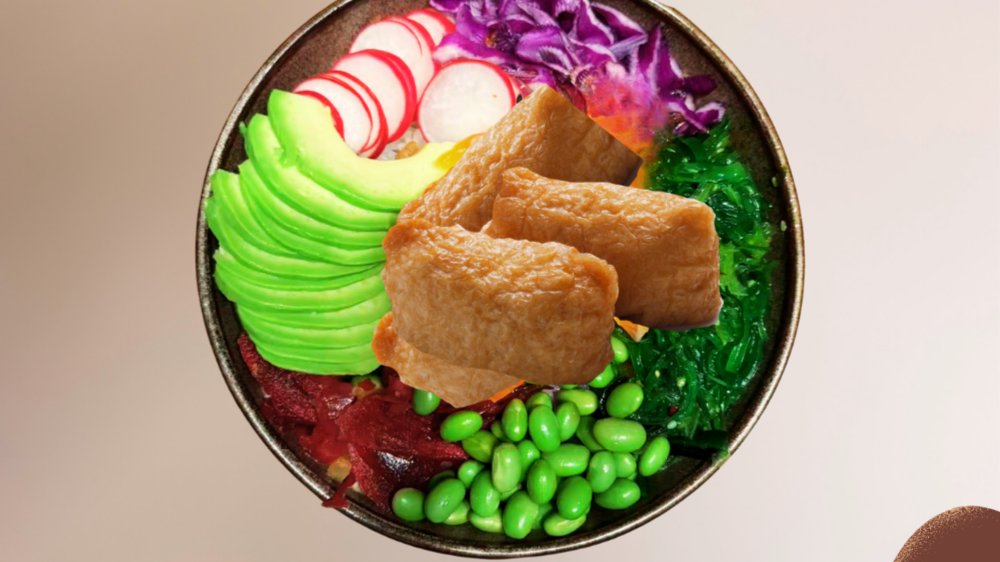 Tofu med Sushi Ris, Goma dressing Edamama bønner, Tangsalat, avocado, radish, majs