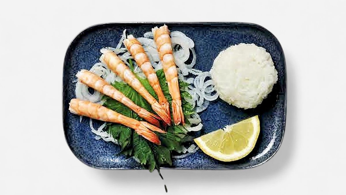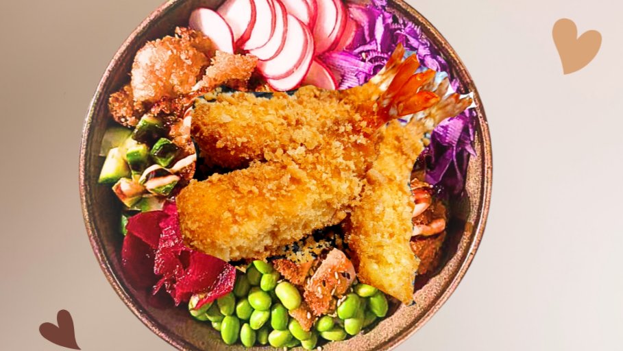 Japansk Crispy Shrimp XL til 3stk. med Sushi Ris, teriyaki mayo, Edamama bønner, sylte rød løg, red cabbage, avocado, ananas