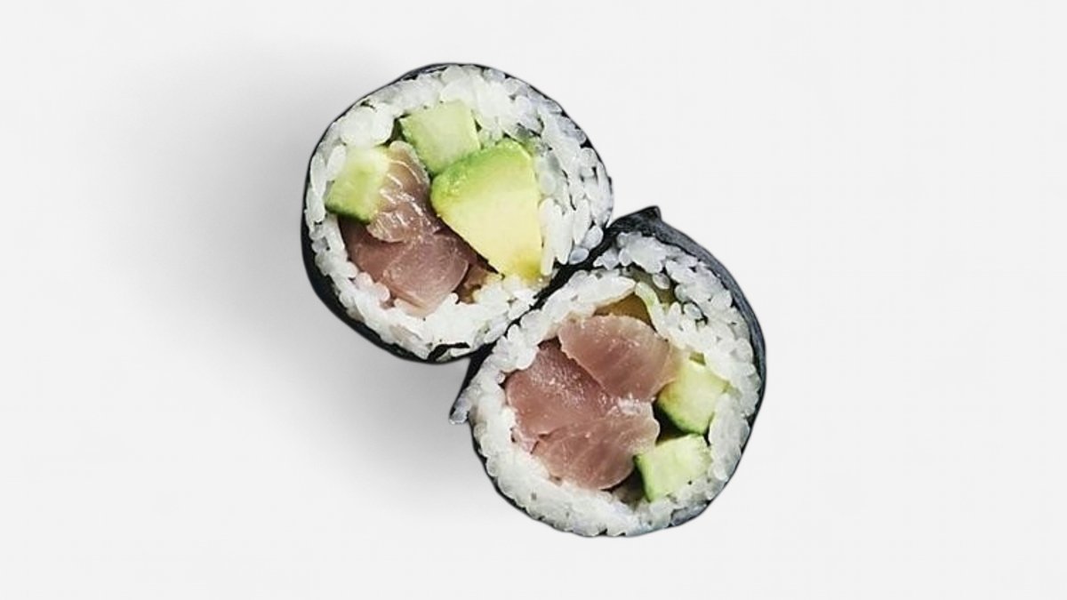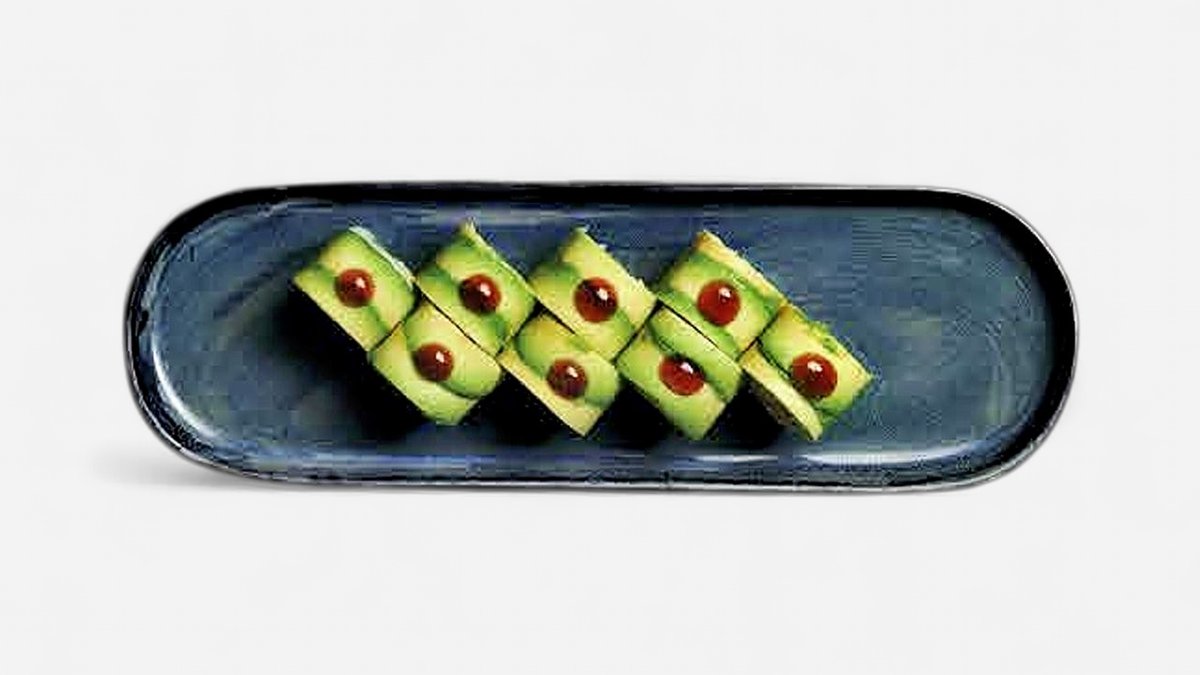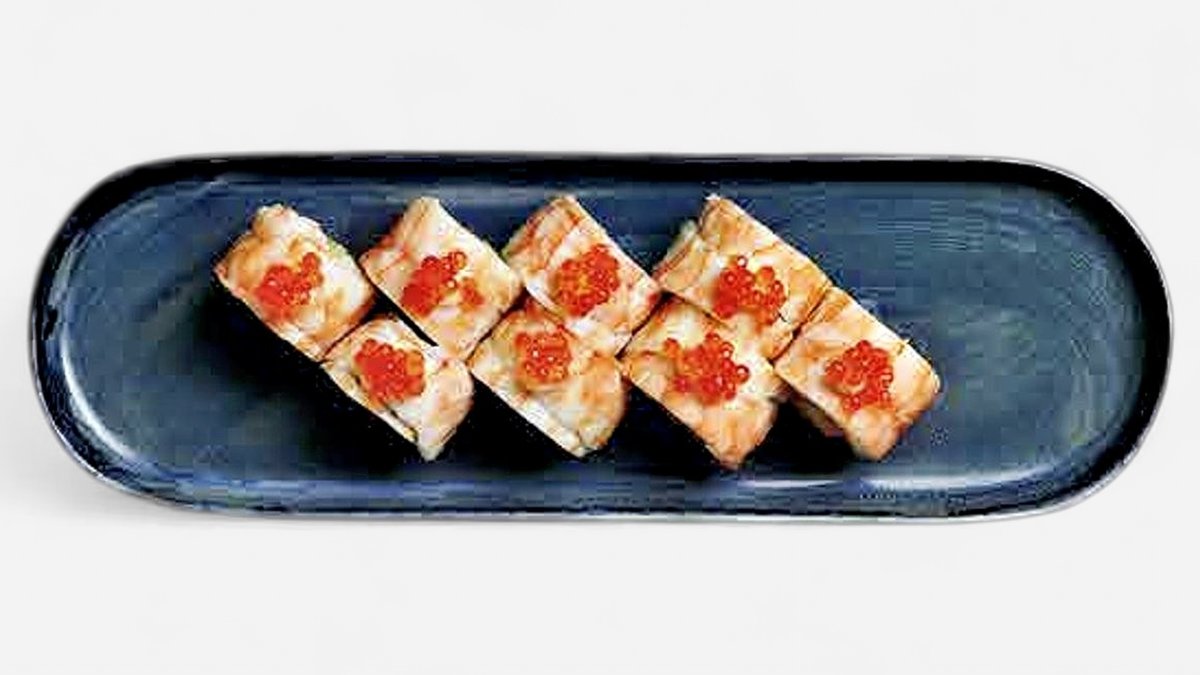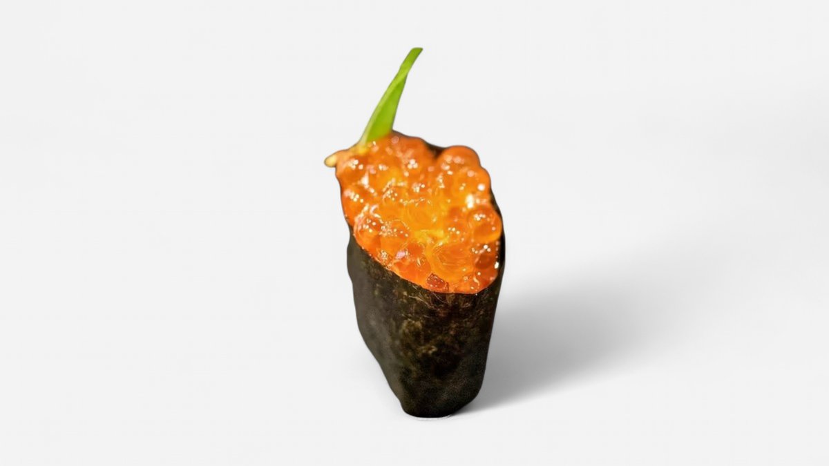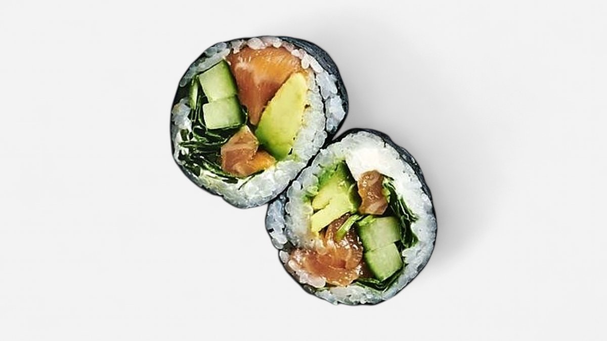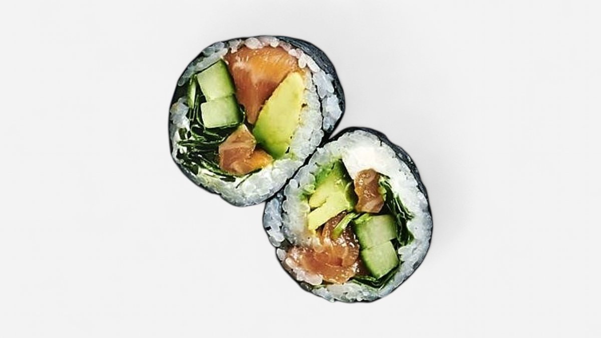 Laks, agurk, avocado og flødeost rullet i tobiko.