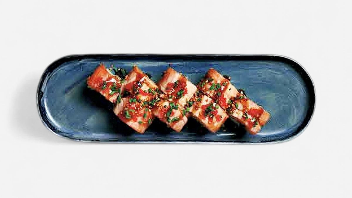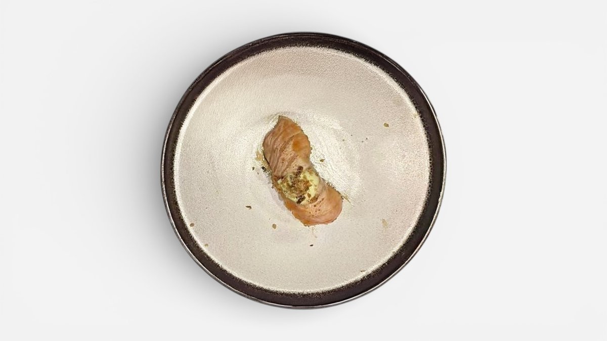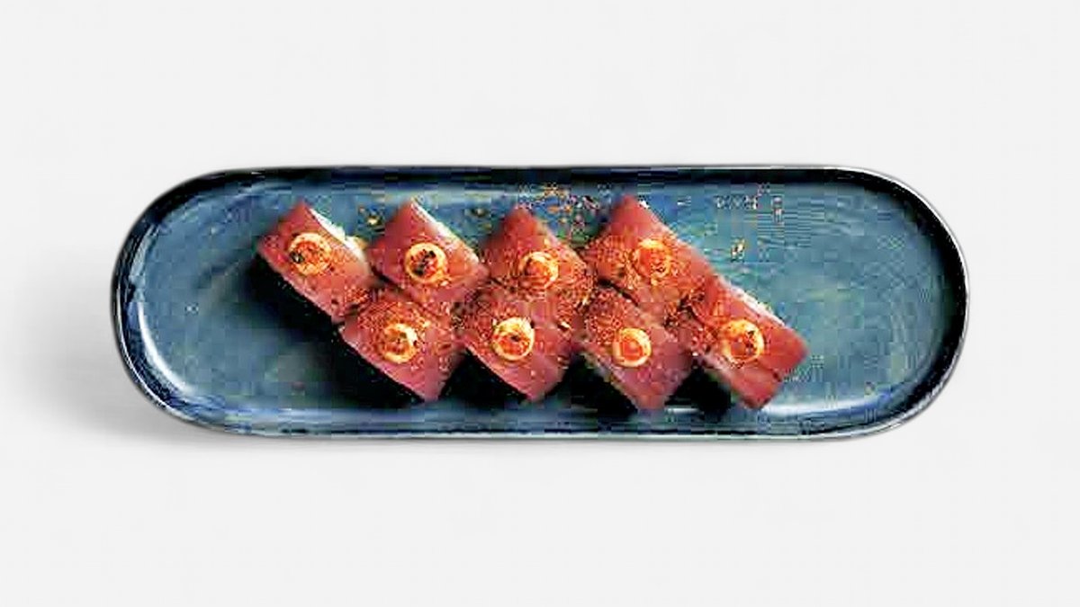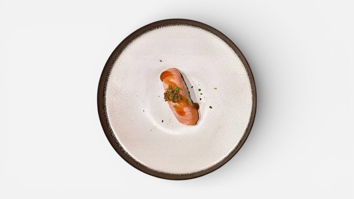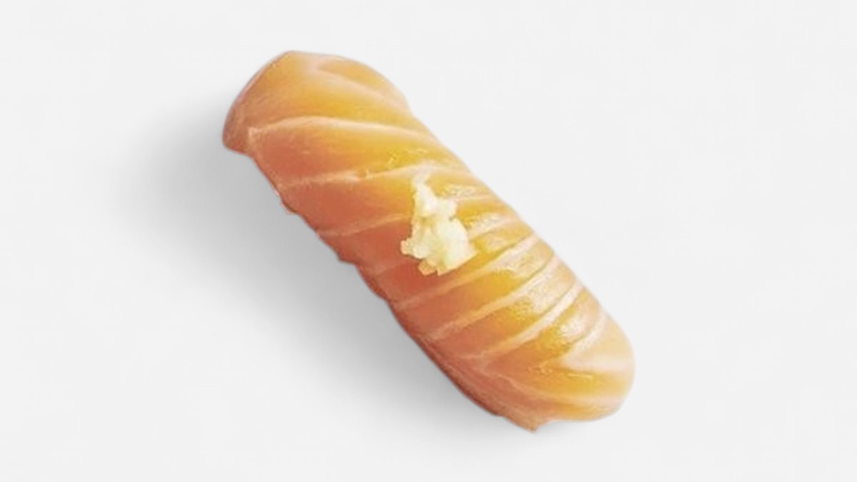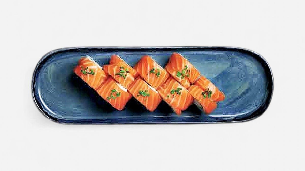 Alaska: laks m. flødeost, avocado, rulled i tobiko 2stk flamberet nigiri m.teriyaki, chilipulver, purløg 2stk lasks nigiri