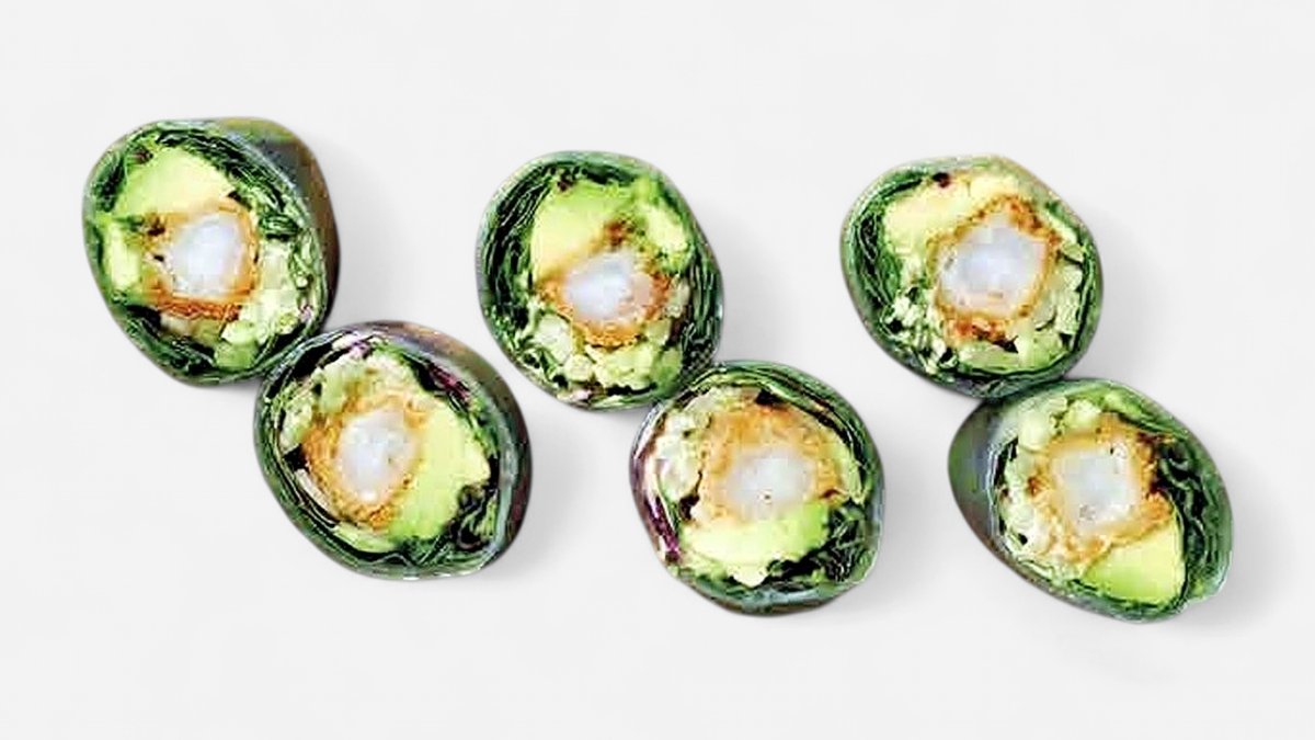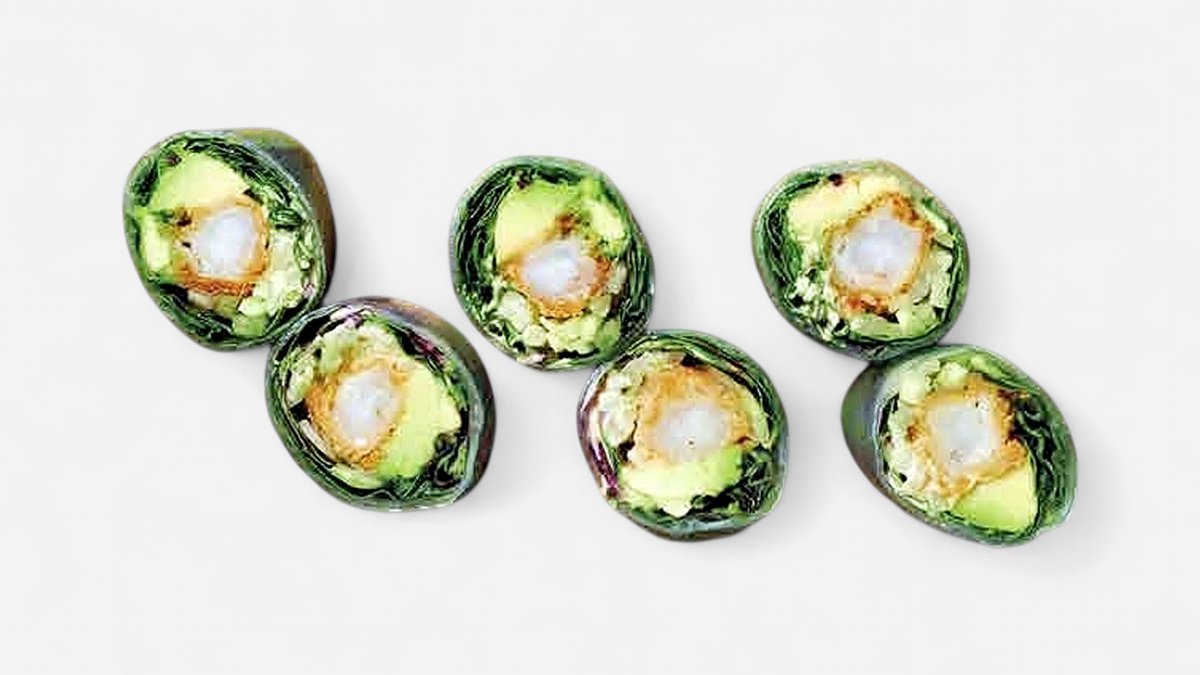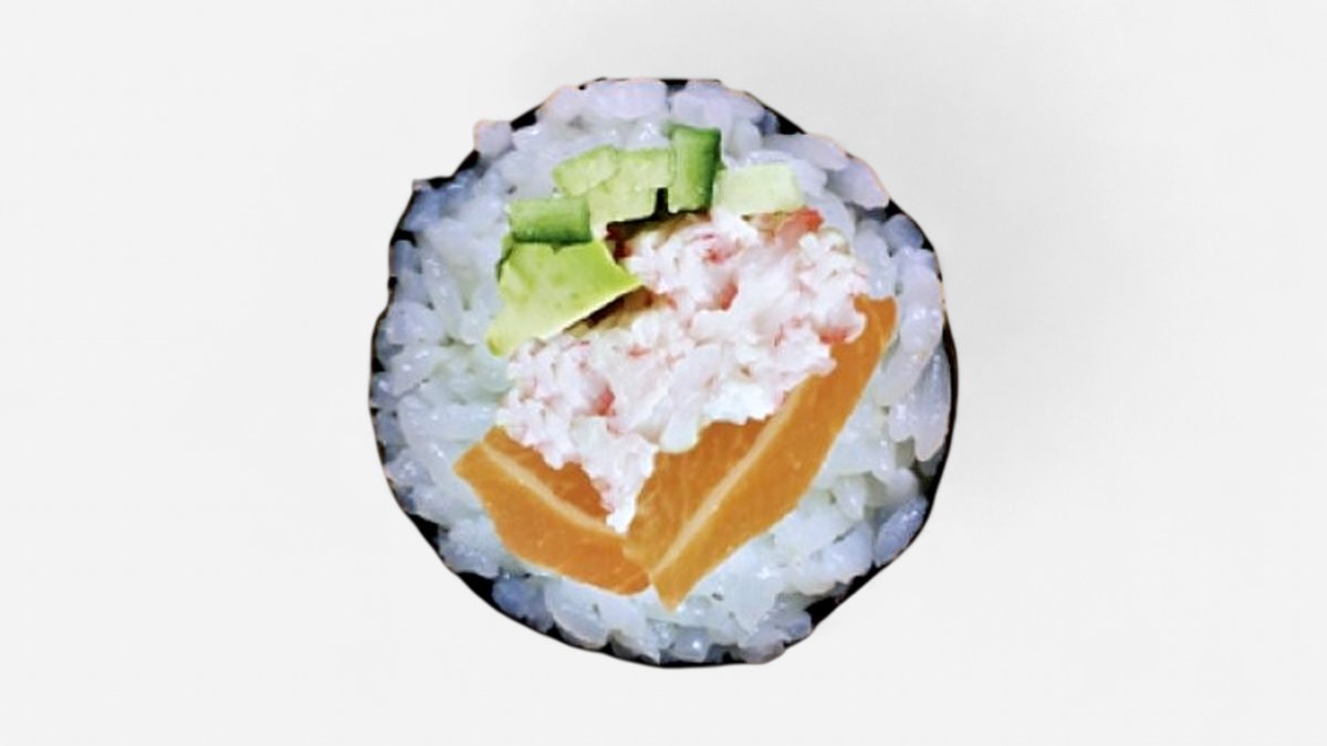 Laks, rejer, agurk, avocado og spicy sauce rullet i wasabi tobiko.