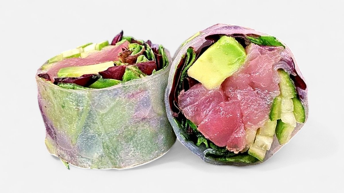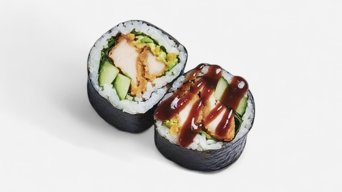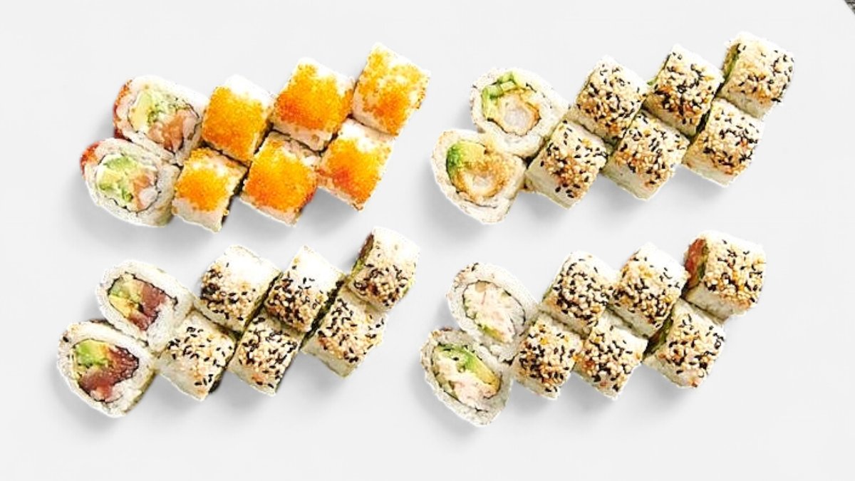 California roll m. surimi, avocado, agurk i seasam Crispy chicken m. avocado, chilimayo, i seasam; Ebi tempura rejer m. avocado, chilimayo i seasam; SpicyTun m. avocado, agurk og chilimayo i seasam; Alaska laks m.flødeost avocado rulled i tobiko