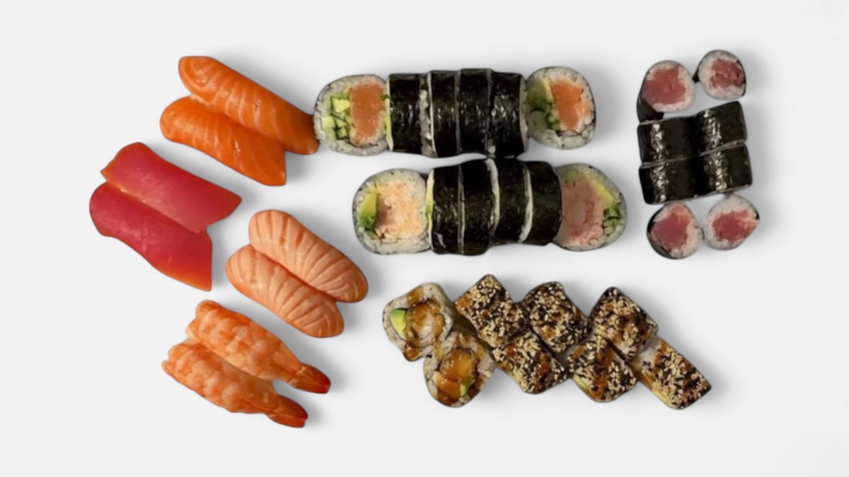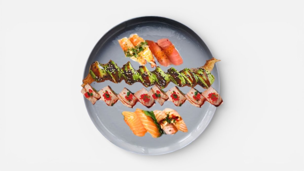 Nigiri: 2 x Laks 2 x Tun 2 x reje 2 x flamberet laks Uramaki: 8 x Ebi Furai Roll eller Crispy Chicken Roll Futomaki 6 x California Big Roll 6 x Laks Big Roll Hosomaki 8 x Tun Roll